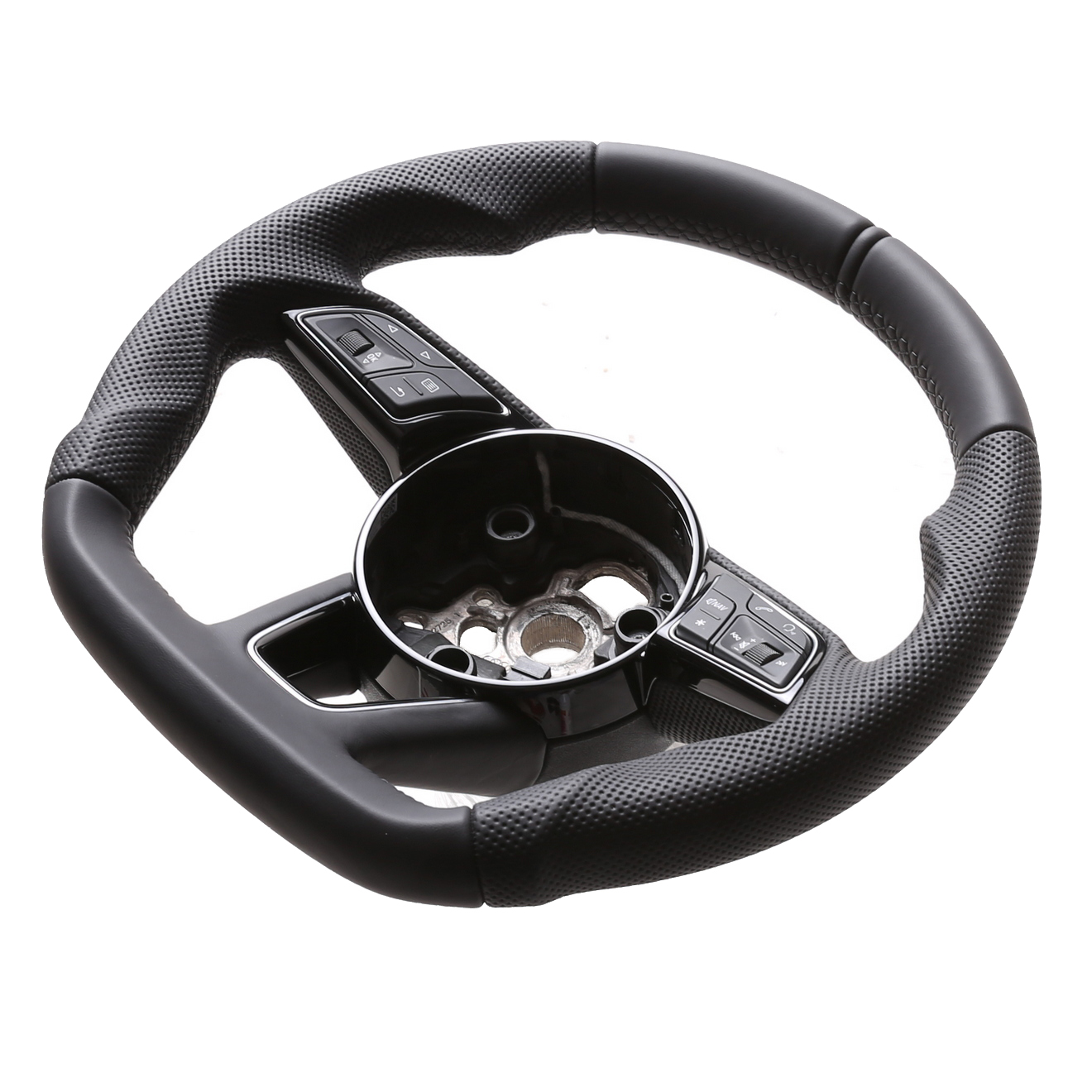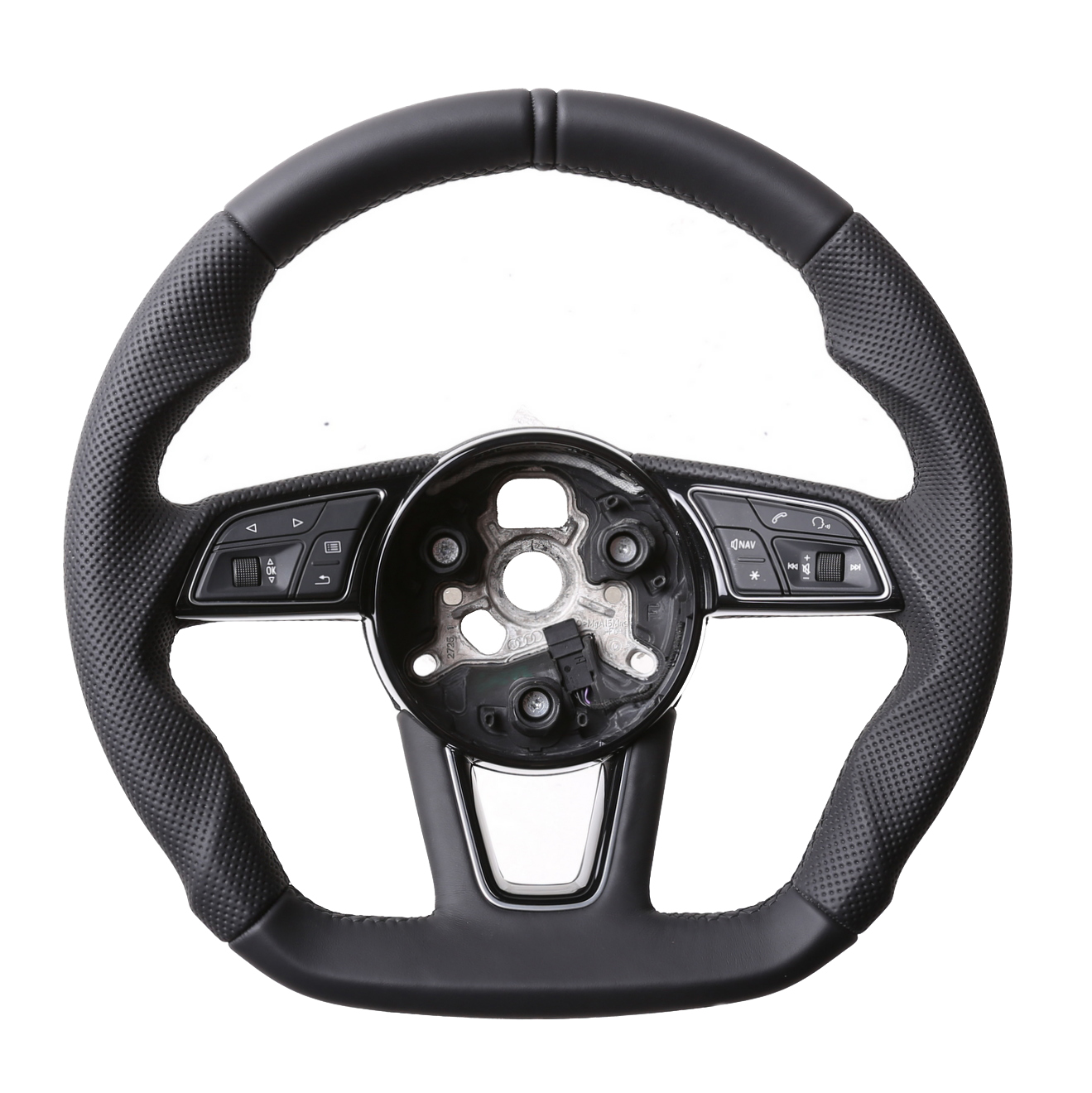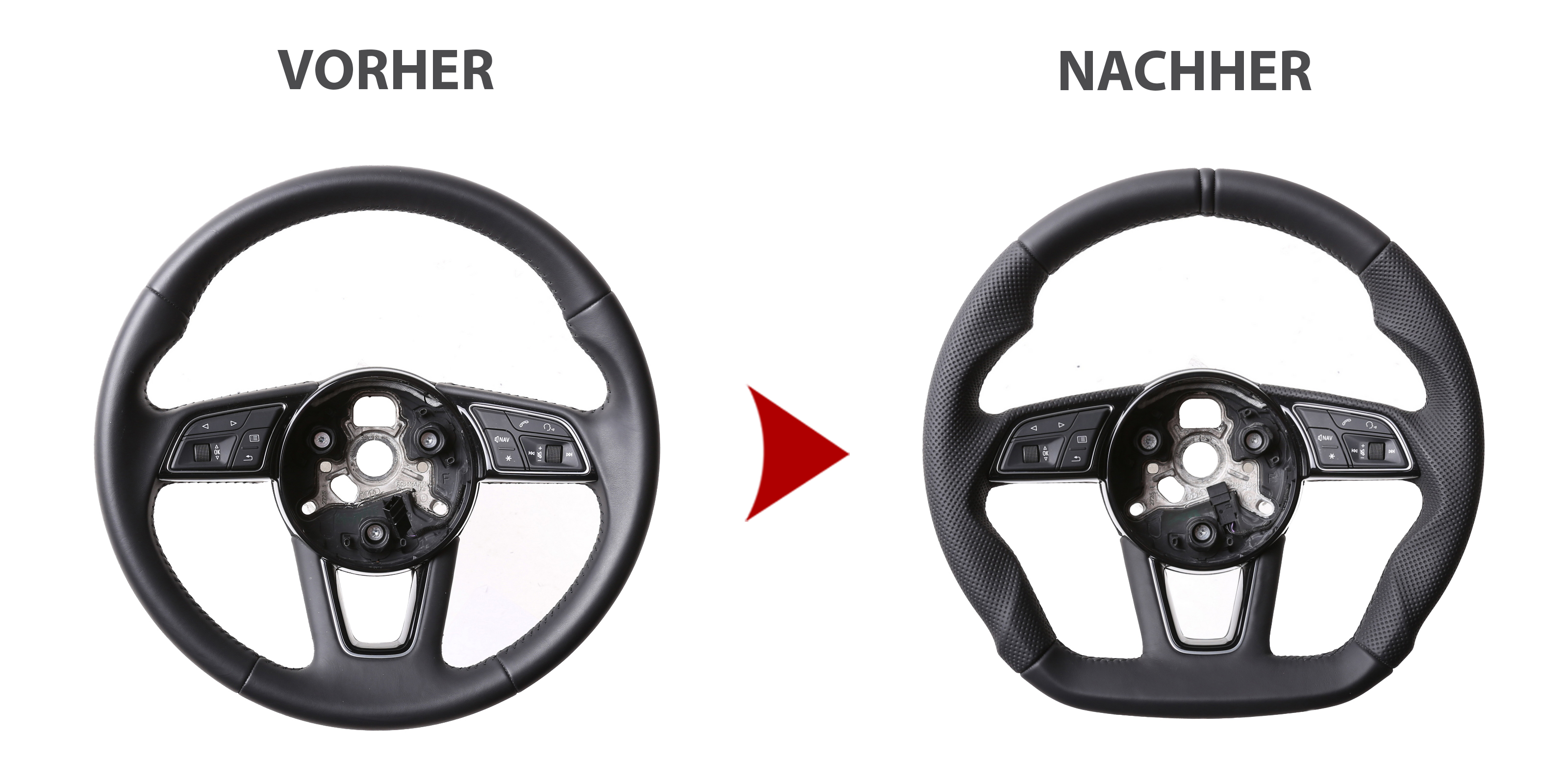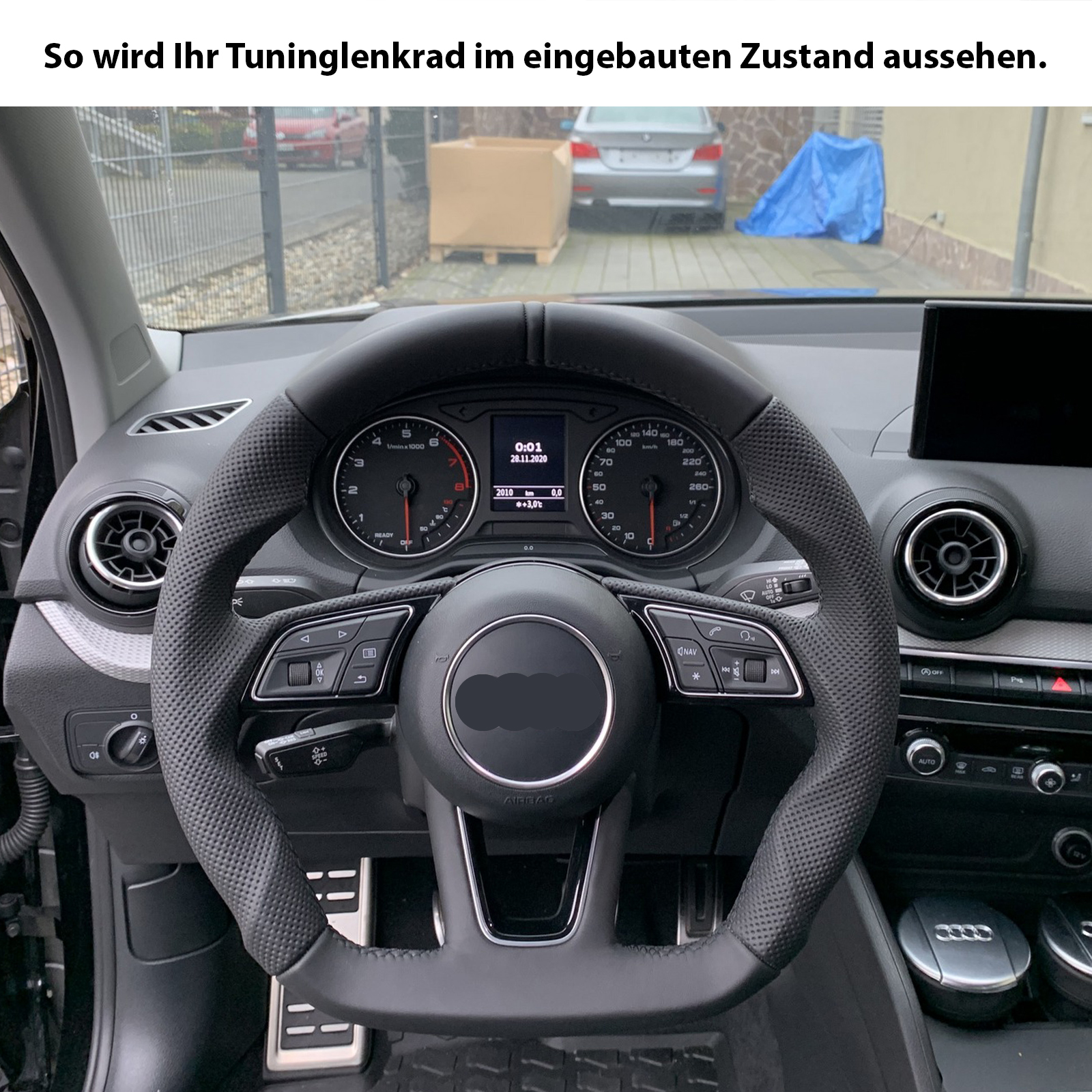Originalfarbe schwarz, ein Kombibezug aus Audi Nappa und perforiertem Leder, 12 Uhr Markierung, Naht schwarz