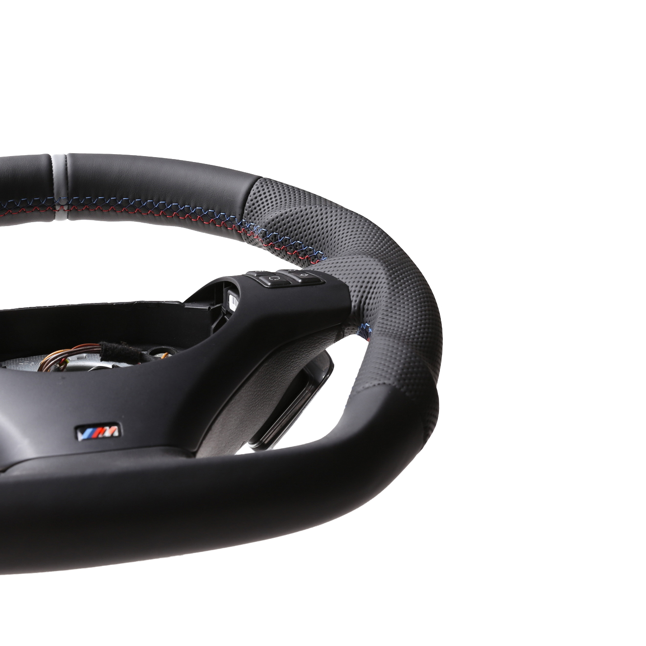 Originalfarbe schwarz, ein Kombibezug aus BMW Nappa und perforiertem Leder, 12 Uhr Markierung grau, BMW M-Naht