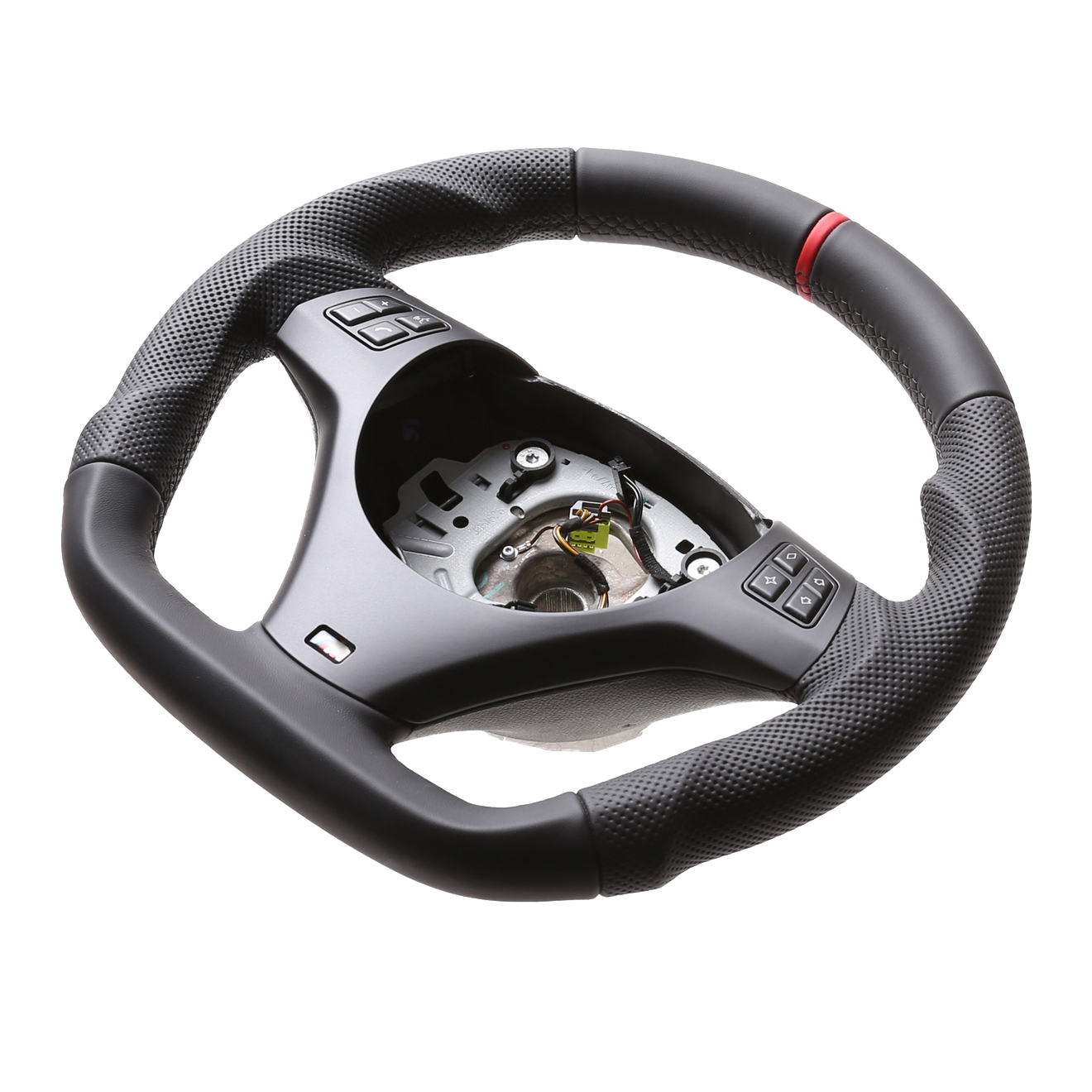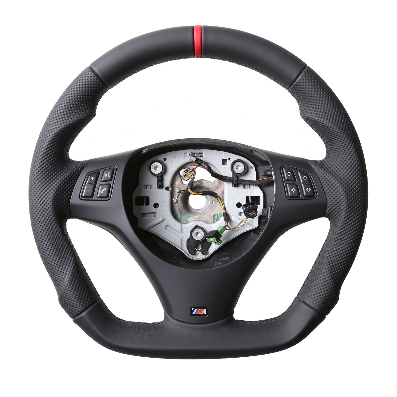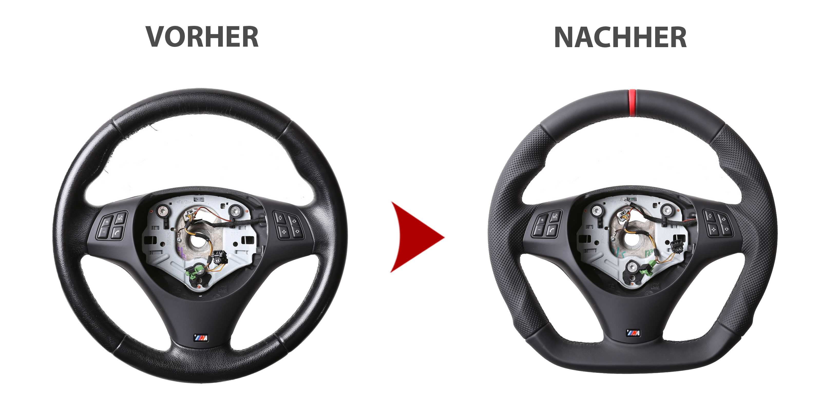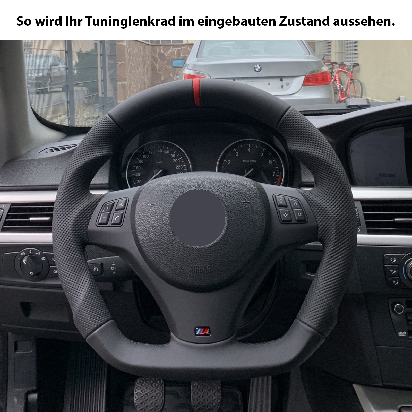 Produktinformationen "BMW Lenkrad E84 X1 E87 E88 E90 E91 M-Sport Abgeflacht Kombibezug 12 Uhr Markierung rot Naht schwarz"