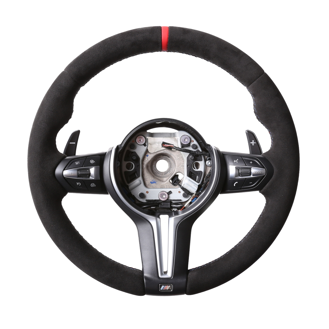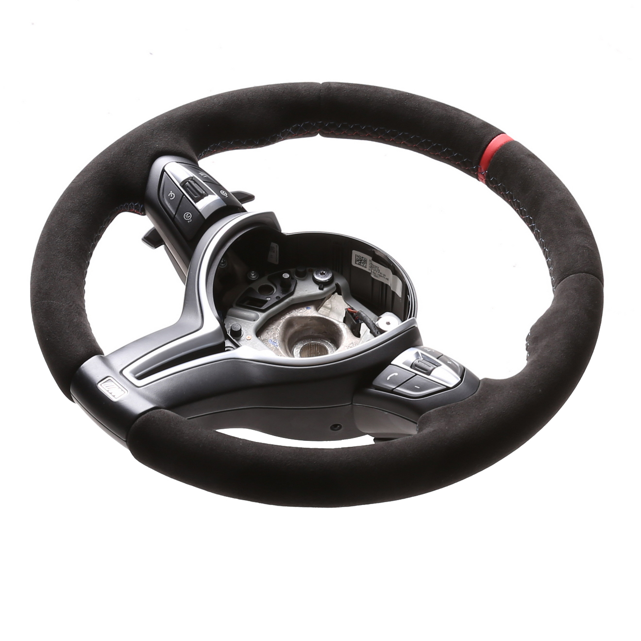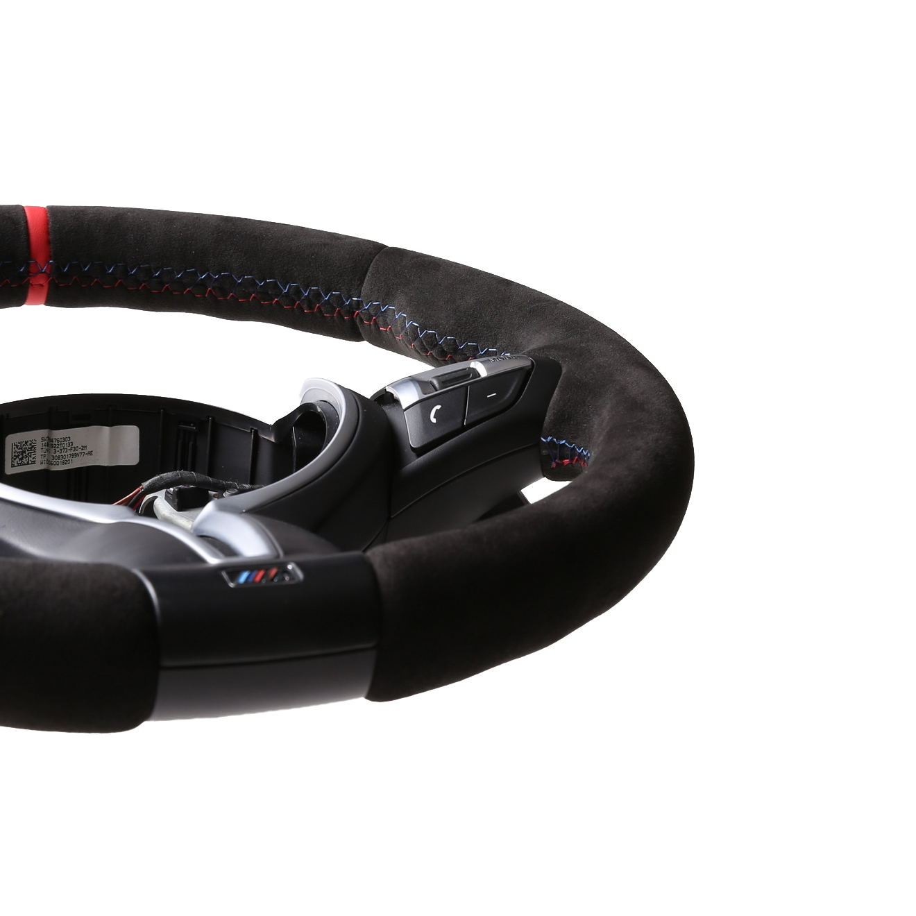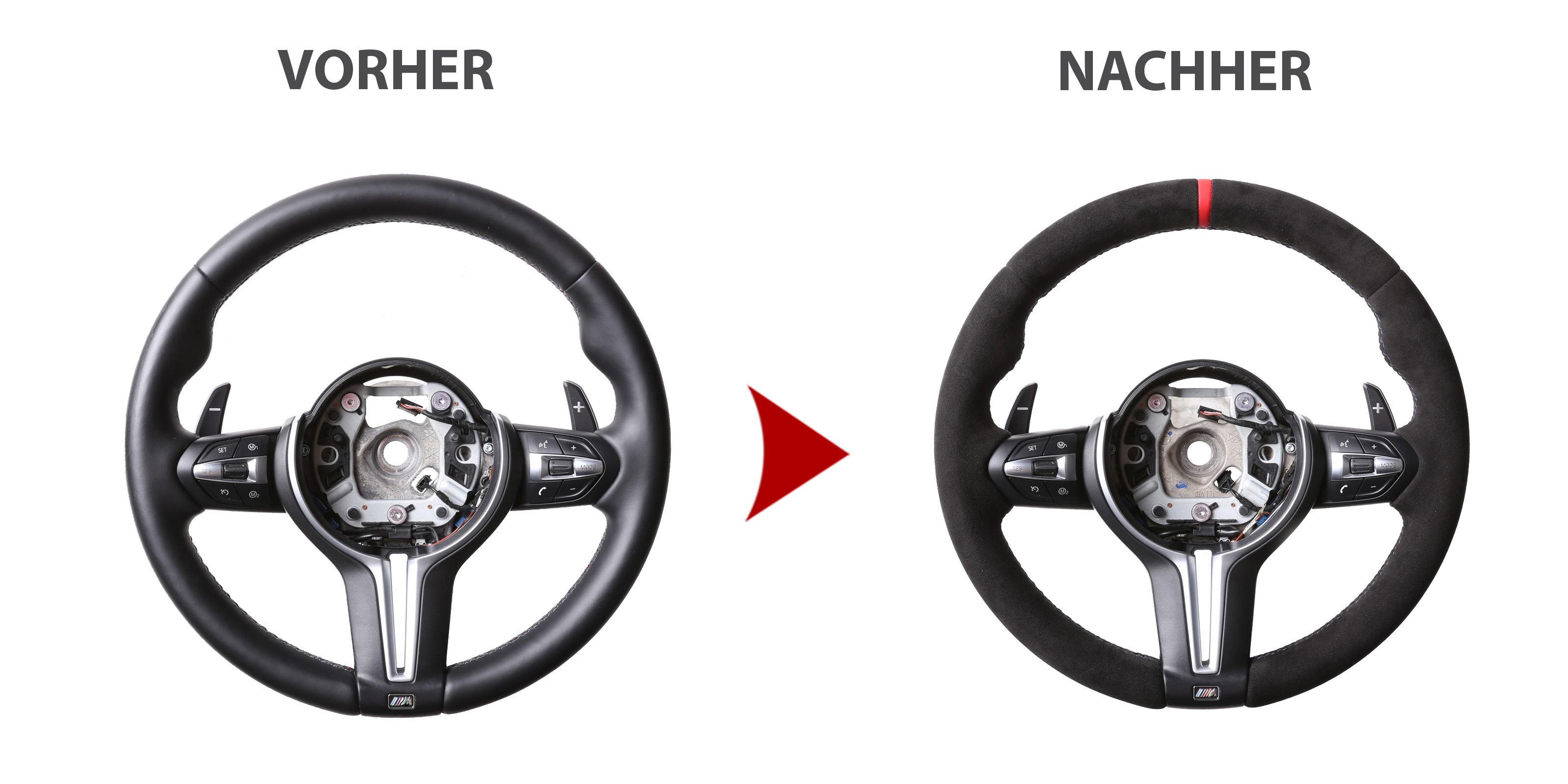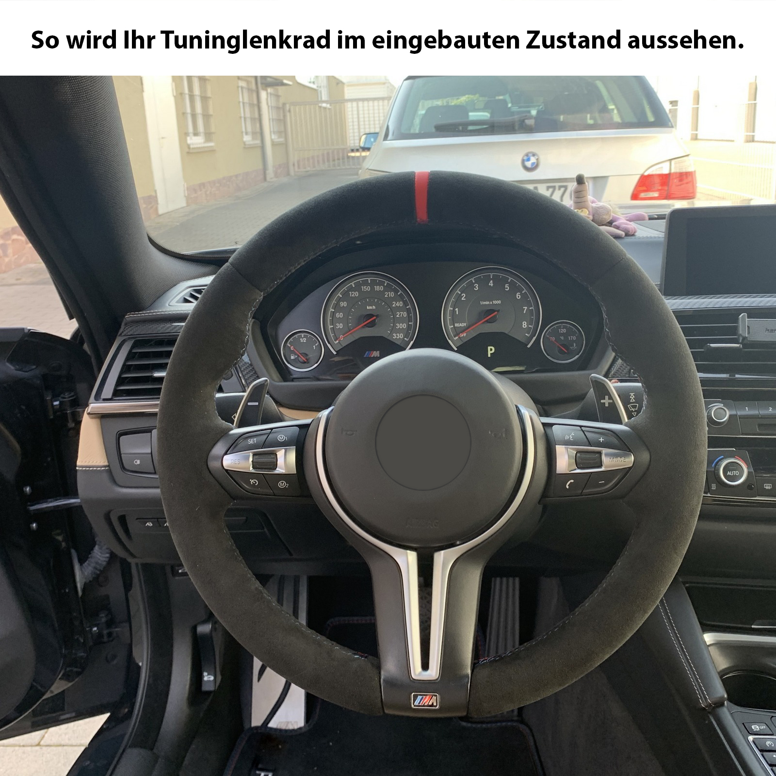 Originalfarbe schwarz, ein Bezug aus BMW Alcantara Leder, 12 Uhr Markierung rot, M-Naht