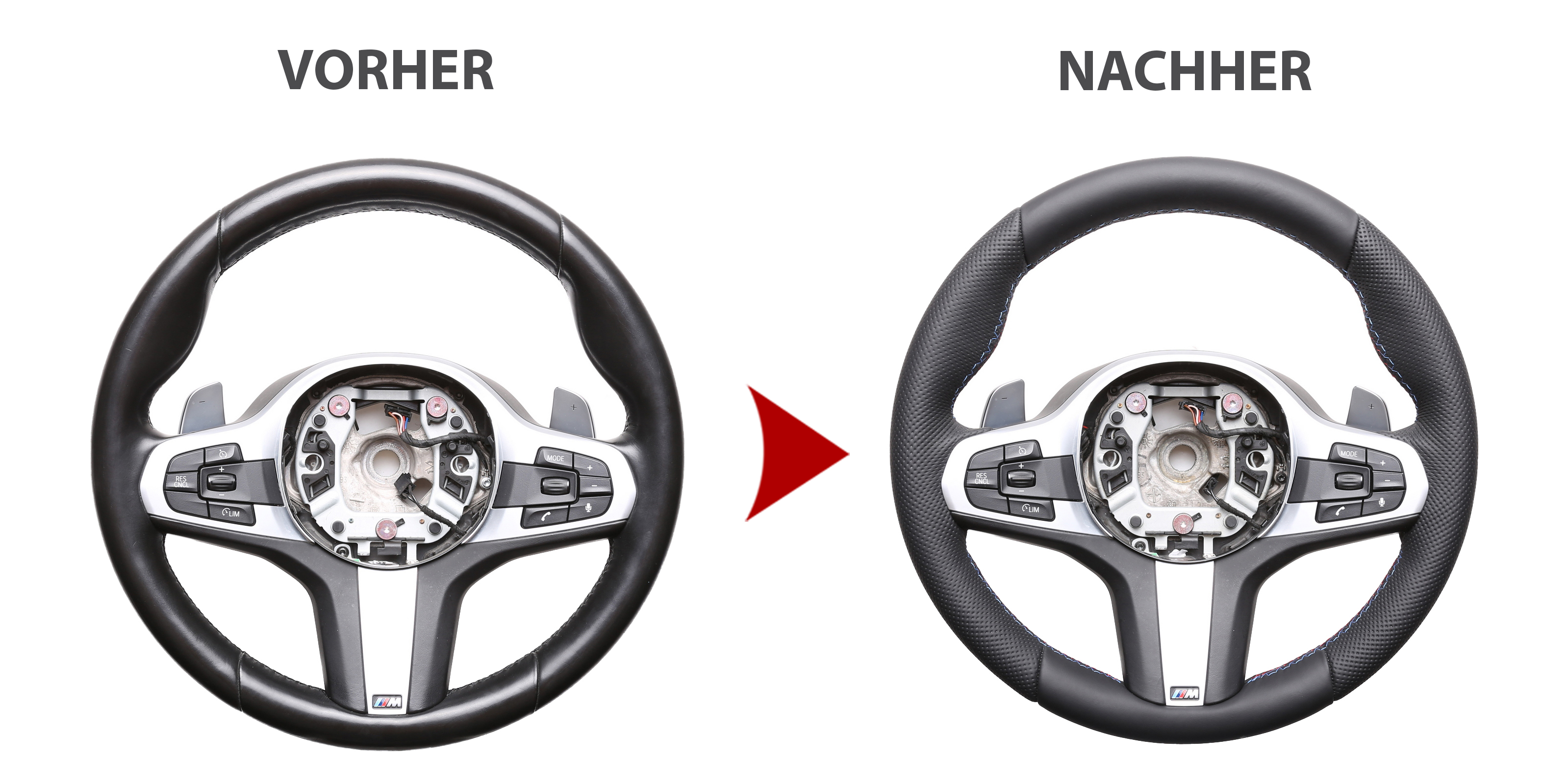 Des Weiteren bieten wir auch den Neubezug Ihres Lenkrades nach Ihren individuellen Vorstellungen bei uns vor Ort an. Sollte es Ihr Lenkradmodell ausnahmsweise nicht in unserem Sortiment geben, dann können wir Ihnen Ihr Lenkrad ausbauen, innerhalb von 4-5 Stunden den Wunschbezug anfertigen und anschließend können Sie wieder nach fachgerechtem Einbau durch uns ohne lange Versandwartezeiten und teure Werkstattbesuche mit Ihrem neu bezogenen Lederlenkrad nach Hause fahren!