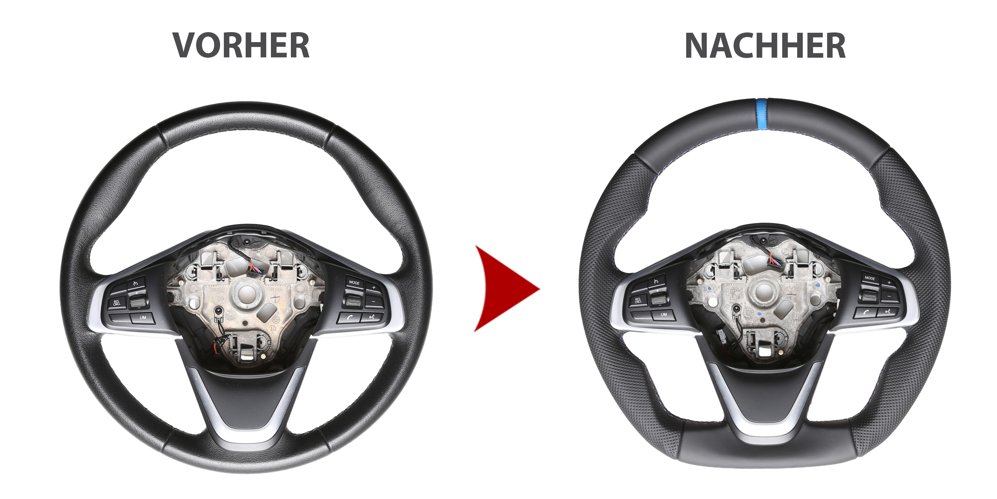 Des Weiteren bieten wir auch den Neubezug Ihres Lenkrades nach Ihren individuellen Vorstellungen bei uns vor Ort an. Sollte es Ihr Lenkradmodell ausnahmsweise nicht in unserem Sortiment geben, dann können wir Ihnen Ihr Lenkrad ausbauen, innerhalb von 4-5 Stunden den Wunschbezug anfertigen und anschließend können Sie wieder nach fachgerechtem Einbau durch uns ohne lange Versandwartezeiten und teure Werkstattbesuche mit Ihrem neu bezogenen Lederlenkrad nach Hause fahren!