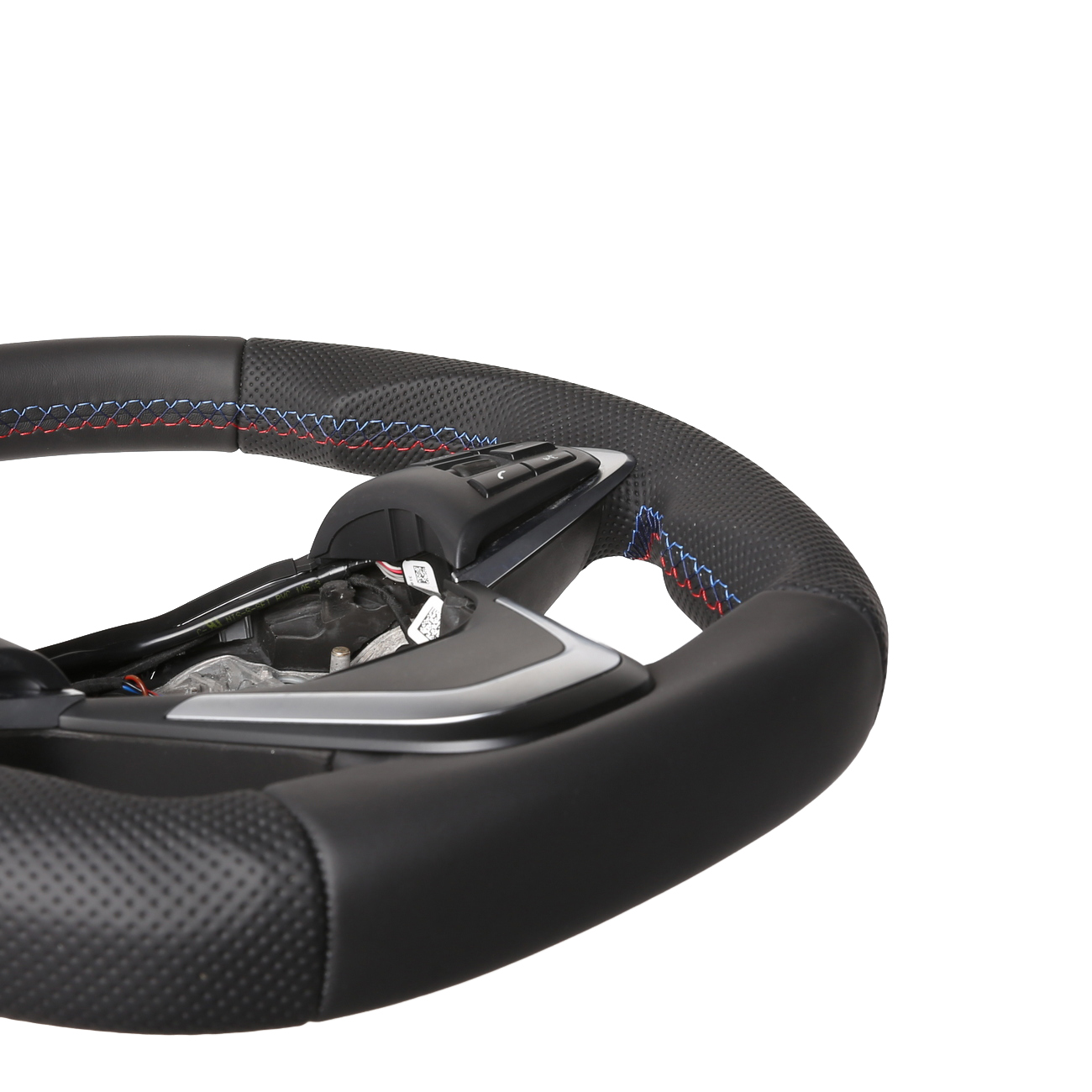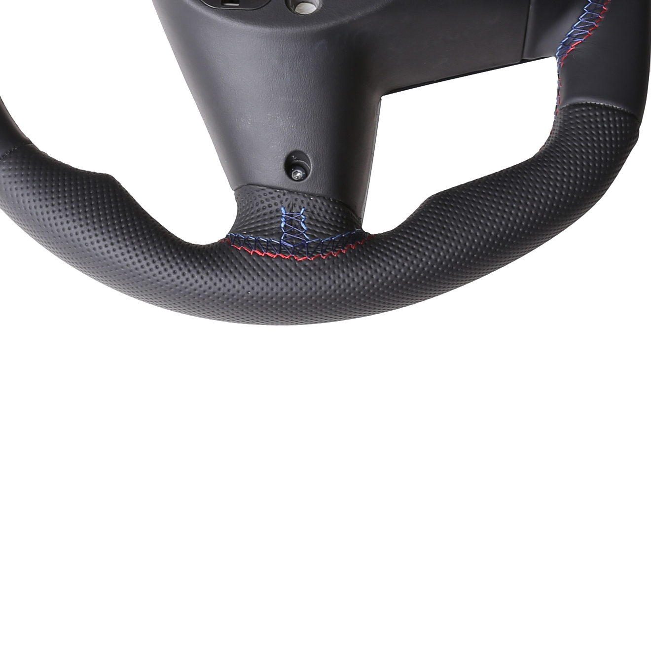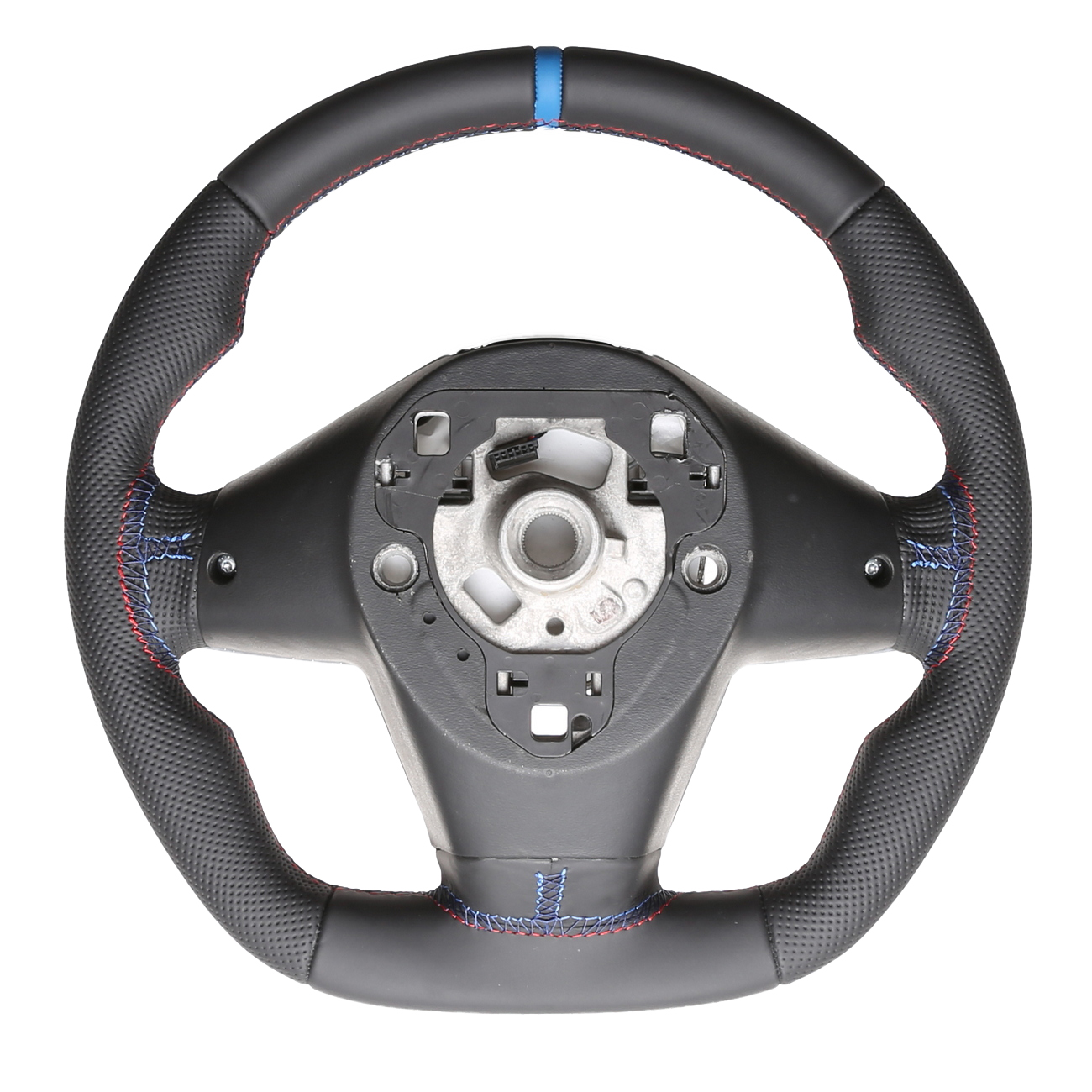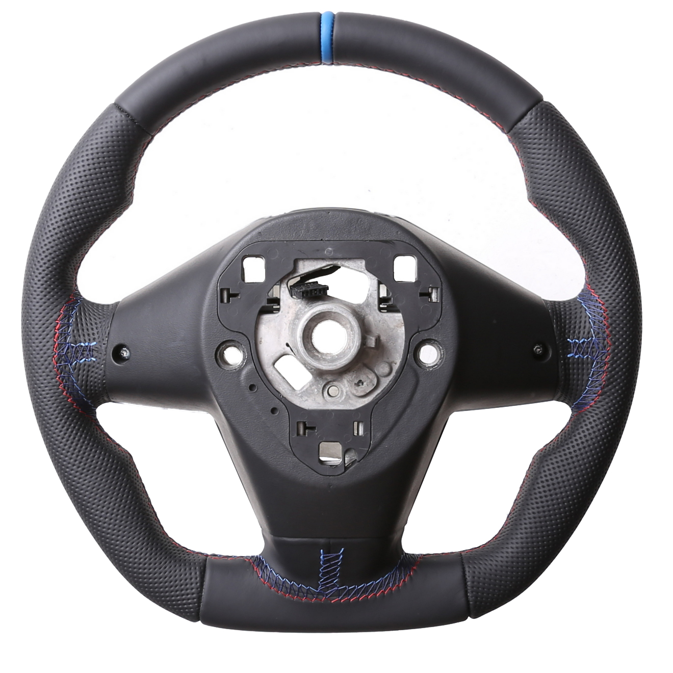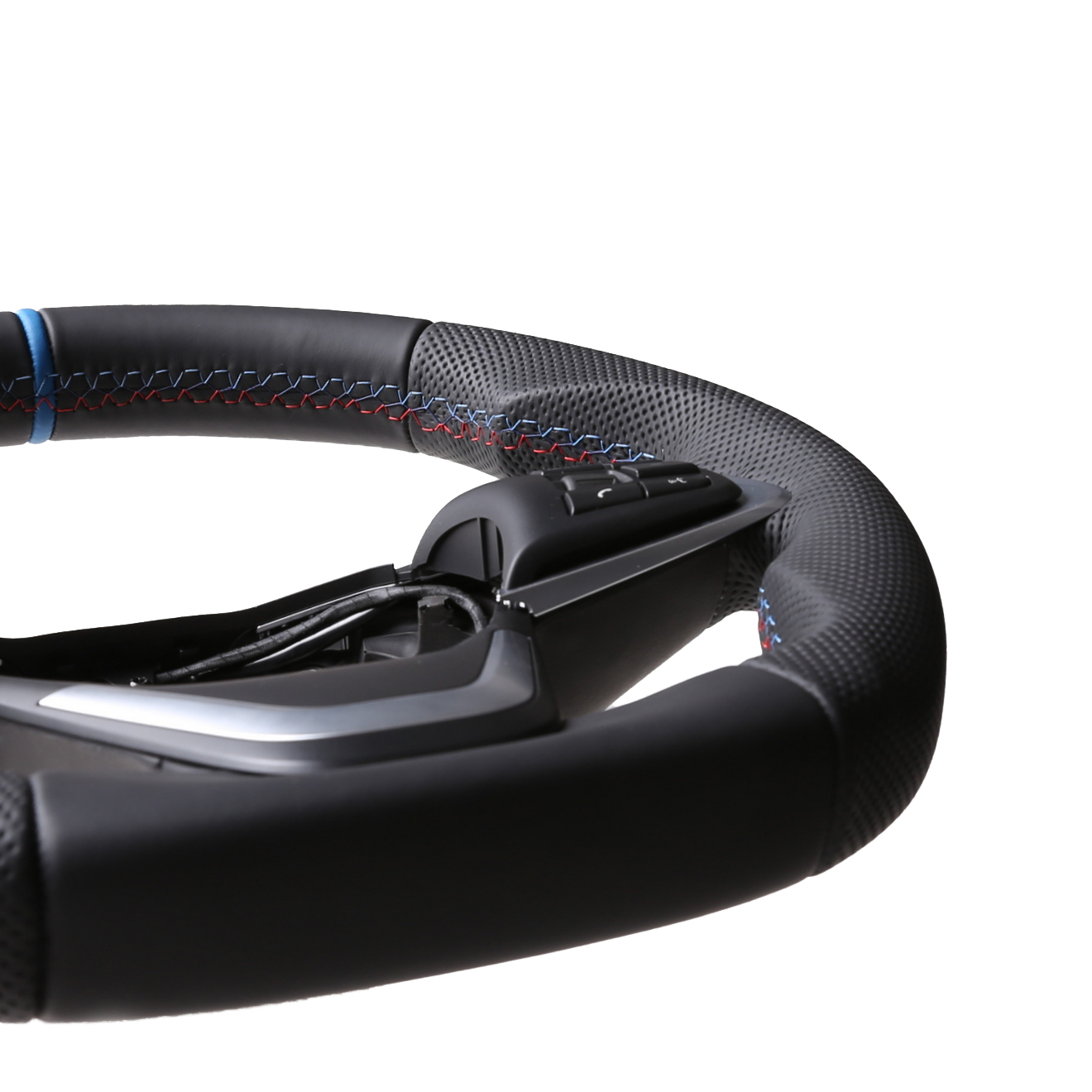 Originalfarbe schwarz, ein Kombibezug aus BMW Nappa und perforiertem Leder, 12 Uhr Markierung hellblau , BMW M-Naht