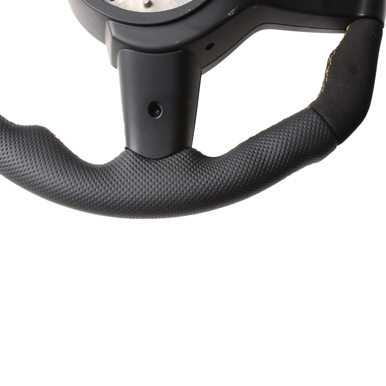 Originalfarbe schwarz, ein Kombibezug aus Alcantara und perforiertem Leder, 12 Uhr Markierung gelb, Naht gelb