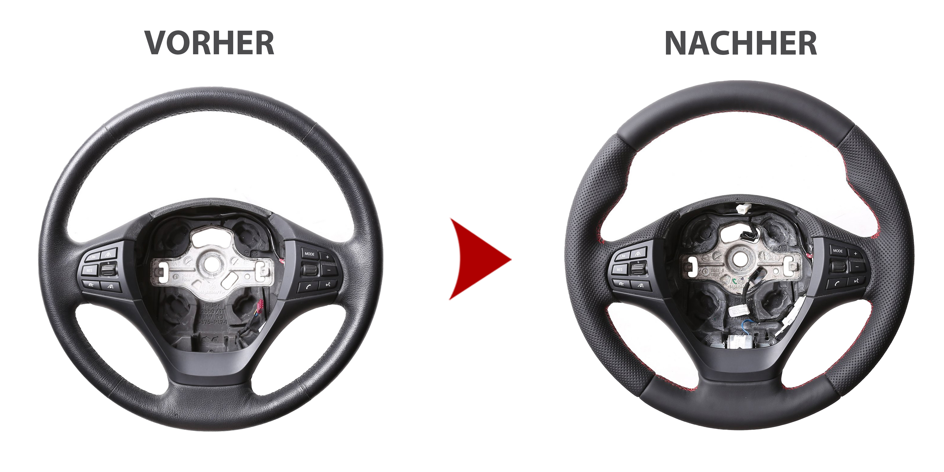Produktinformationen "BMW Lenkrad F15 F20 F21 F22 F25 F30 F31 F32 F33 F34 M-Sport Daumenauflagen Kombibezug Naht rot"