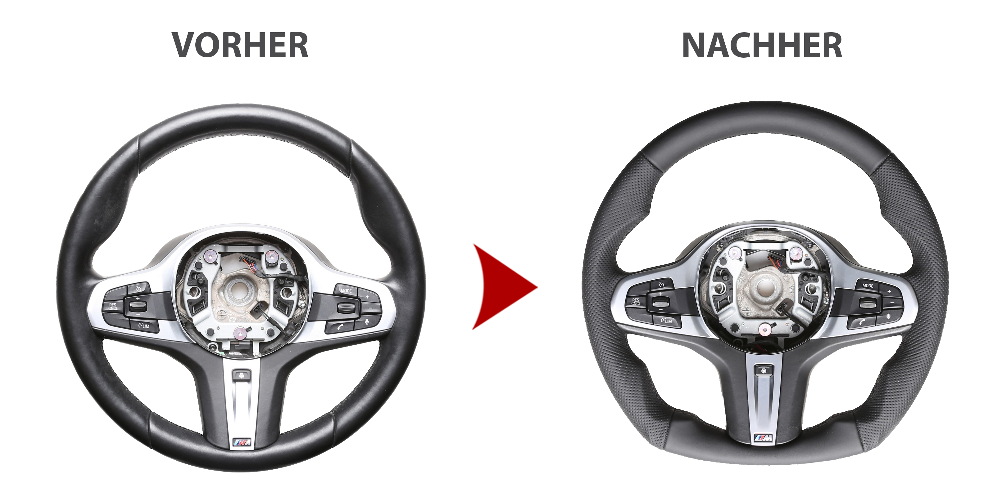 Des Weiteren bieten wir auch den Neubezug Ihres Lenkrades nach Ihren individuellen Vorstellungen bei uns vor Ort an. Sollte es Ihr Lenkradmodell ausnahmsweise nicht in unserem Sortiment geben, dann können wir Ihnen Ihr Lenkrad ausbauen, innerhalb von 4-5 Stunden den Wunschbezug anfertigen und anschließend können Sie wieder nach fachgerechtem Einbau durch uns ohne lange Versandwartezeiten und teure Werkstattbesuche mit Ihrem neu bezogenen Lederlenkrad nach Hause fahren!