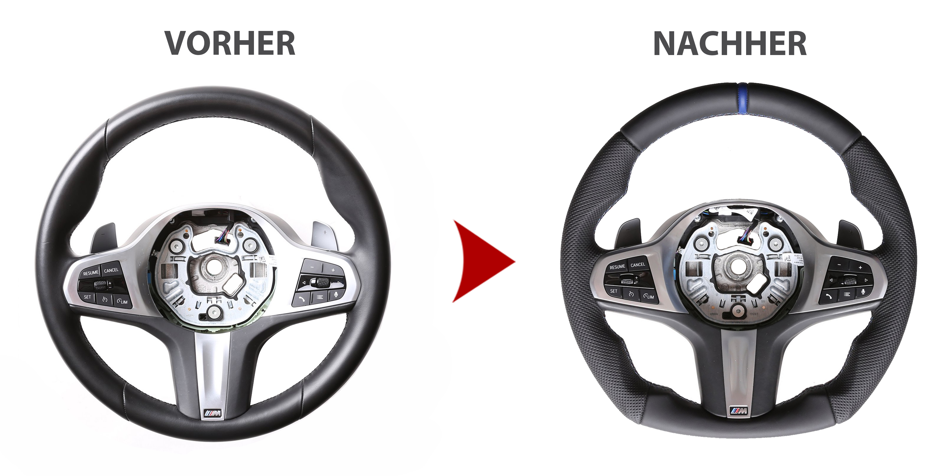 Eigenschaften "BMW Lenkrad G20 G21 G28 G22 G23 G30 G32 F40 F44 Abgeflacht Kombibezug 12 Uhr Markierung blau M-Naht"