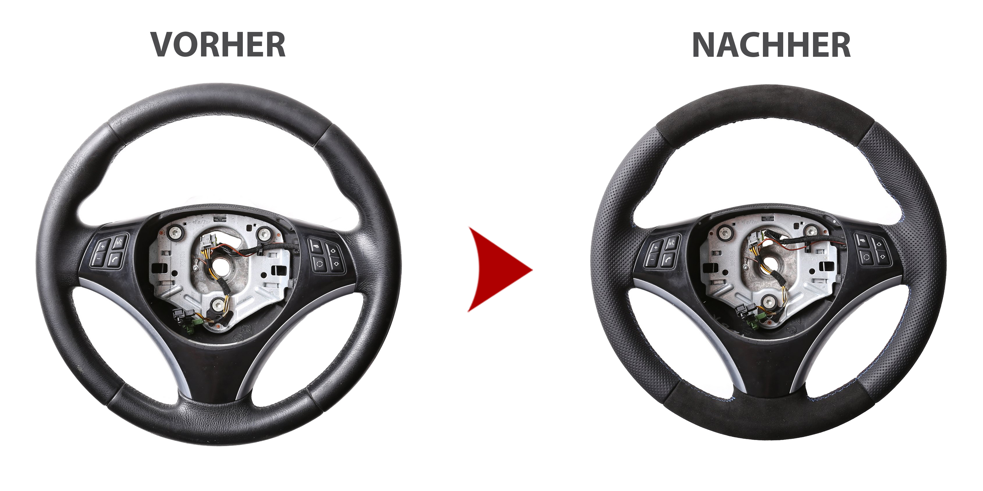 Des Weiteren bieten wir auch den Neubezug Ihres Lenkrades nach Ihren individuellen Vorstellungen bei uns vor Ort an. Sollte es Ihr Lenkradmodell ausnahmsweise nicht in unserem Sortiment geben, dann können wir Ihnen Ihr Lenkrad ausbauen, innerhalb von 4-5 Stunden den Wunschbezug anfertigen und anschließend können Sie wieder nach fachgerechtem Einbau durch uns ohne lange Versandwartezeiten und teure Werkstattbesuche mit Ihrem neu bezogenen Lederlenkrad nach Hause fahren!