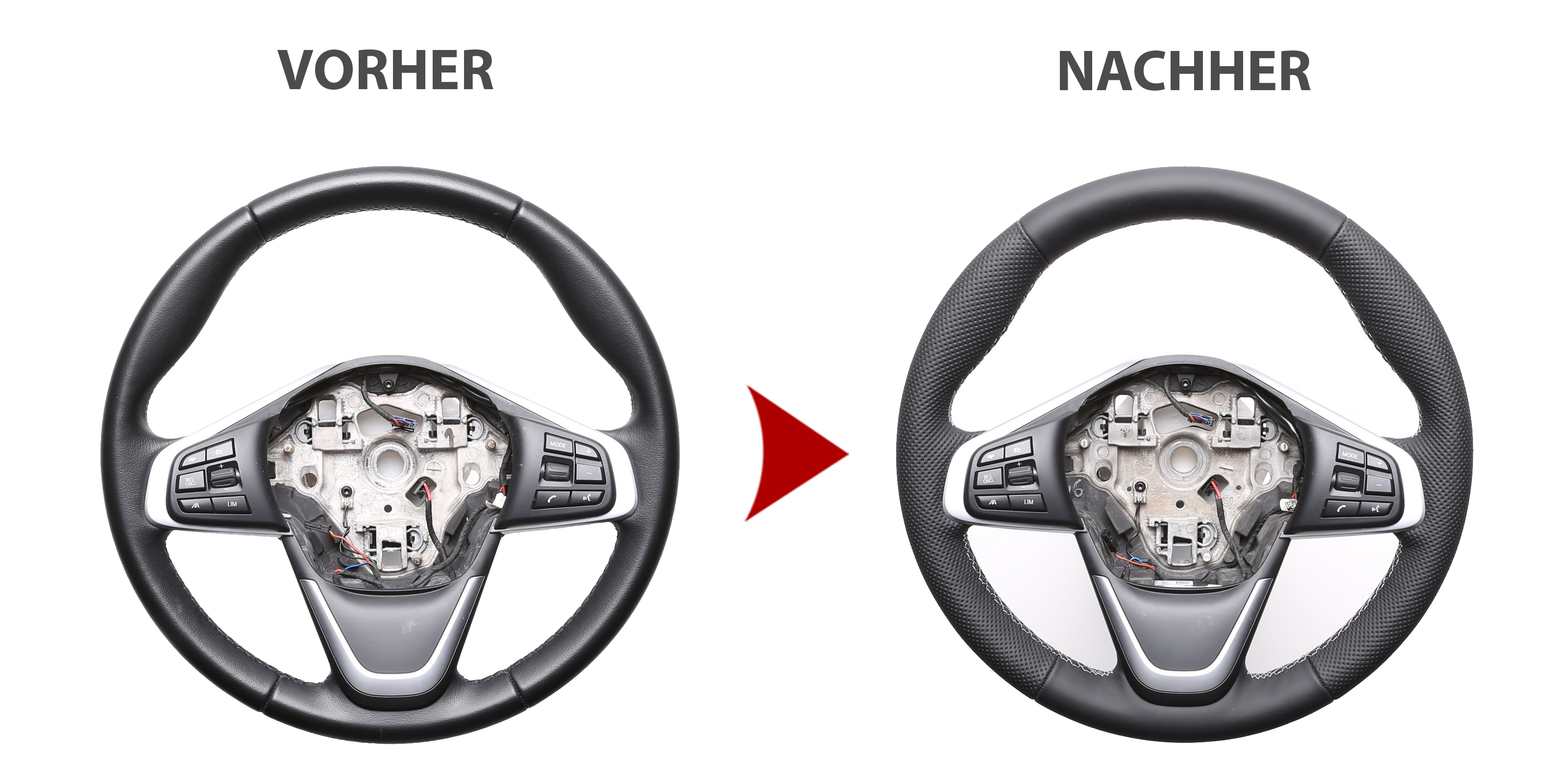 Des Weiteren bieten wir auch den Neubezug Ihres Lenkrades nach Ihren individuellen Vorstellungen bei uns vor Ort an. Sollte es Ihr Lenkradmodell ausnahmsweise nicht in unserem Sortiment geben, dann können wir Ihnen Ihr Lenkrad ausbauen, innerhalb von 4-5 Stunden den Wunschbezug anfertigen und anschließend können Sie wieder nach fachgerechtem Einbau durch uns ohne lange Versandwartezeiten und teure Werkstattbesuche mit Ihrem neu bezogenen Lederlenkrad nach Hause fahren!