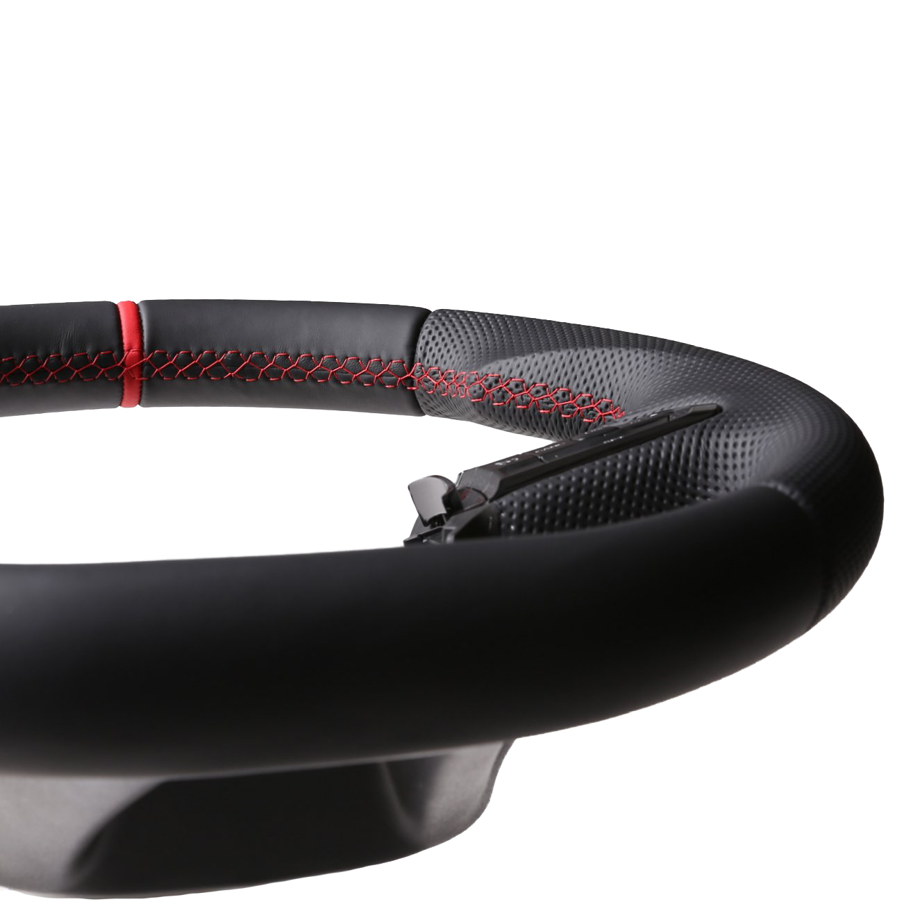Originalfarbe schwarz, ein Kombibezug aus Nappa und perforiertem Leder, 12 Uhr Markierung rot, Naht rot