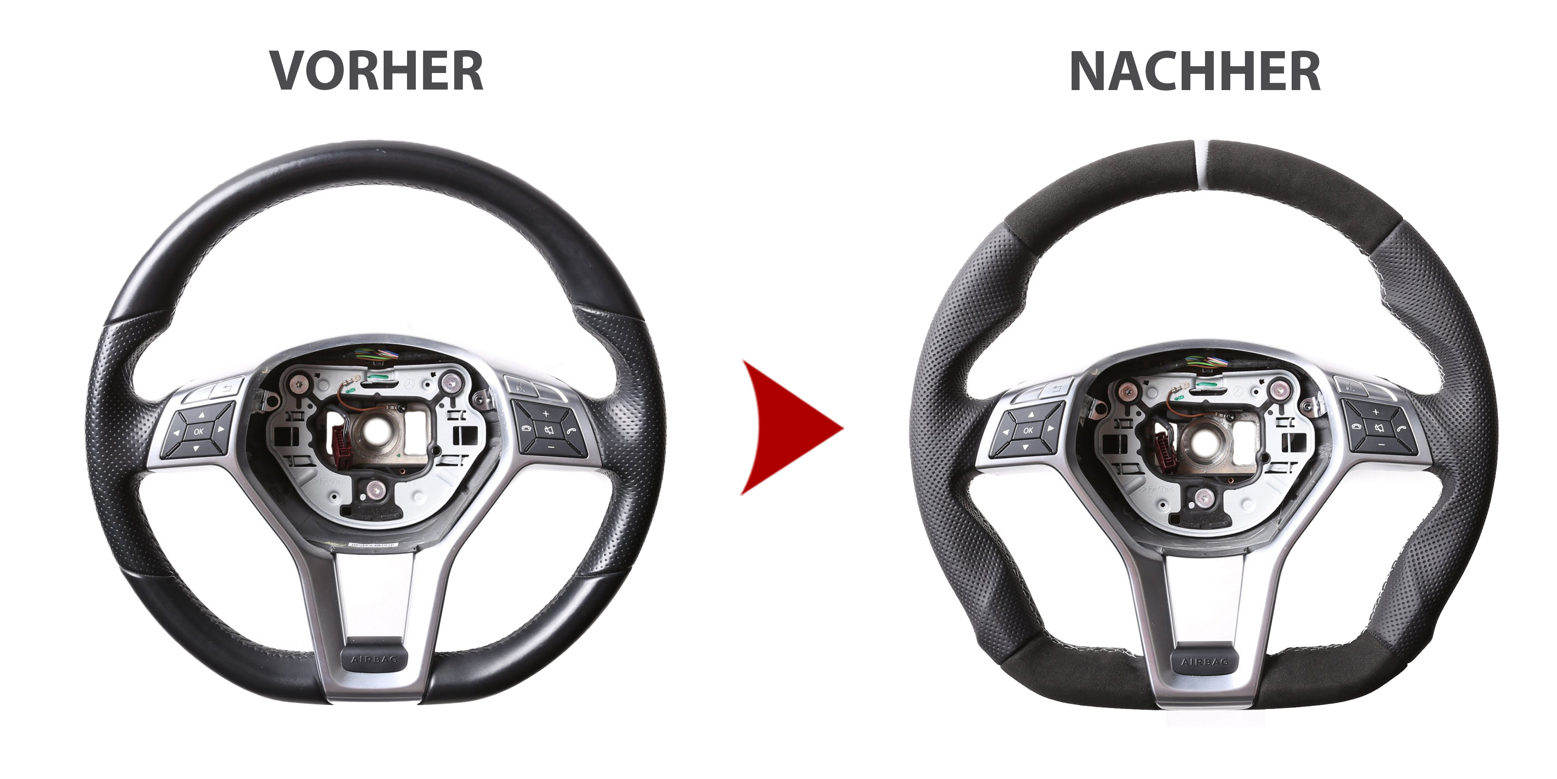 Der Austausch erfolgt ausschließlich gegen ein baugleiches Lenkradmodell. Alle Anbauteile wie Airbag, Multifunktionstasten, Blenden, Schaltwippen oder gar ein Spurhalteassistent übernehmen Sie problemlos von Ihrem Lenkrad. Diese sind nicht im Lieferumfang enthalten.