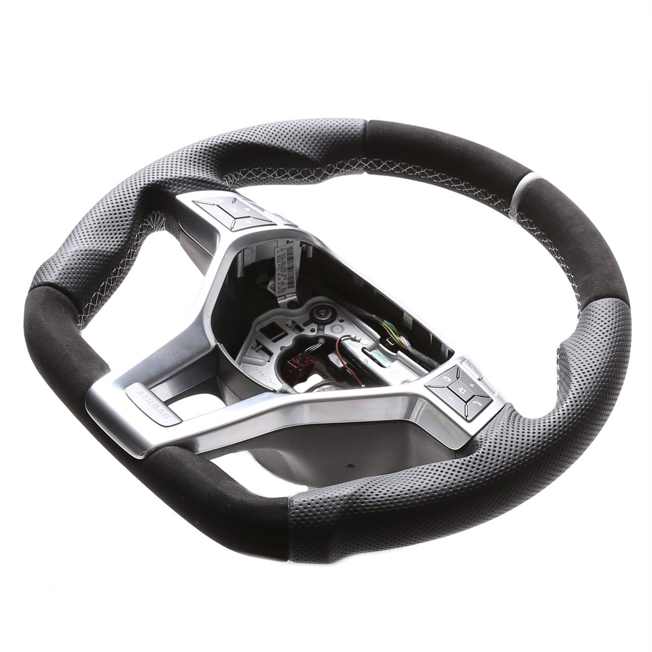Originalfarbe schwarz, ein Kombibezug aus Alcantara Leder und perforiertem Leder, 12 Uhr Markierung silber, Naht silber