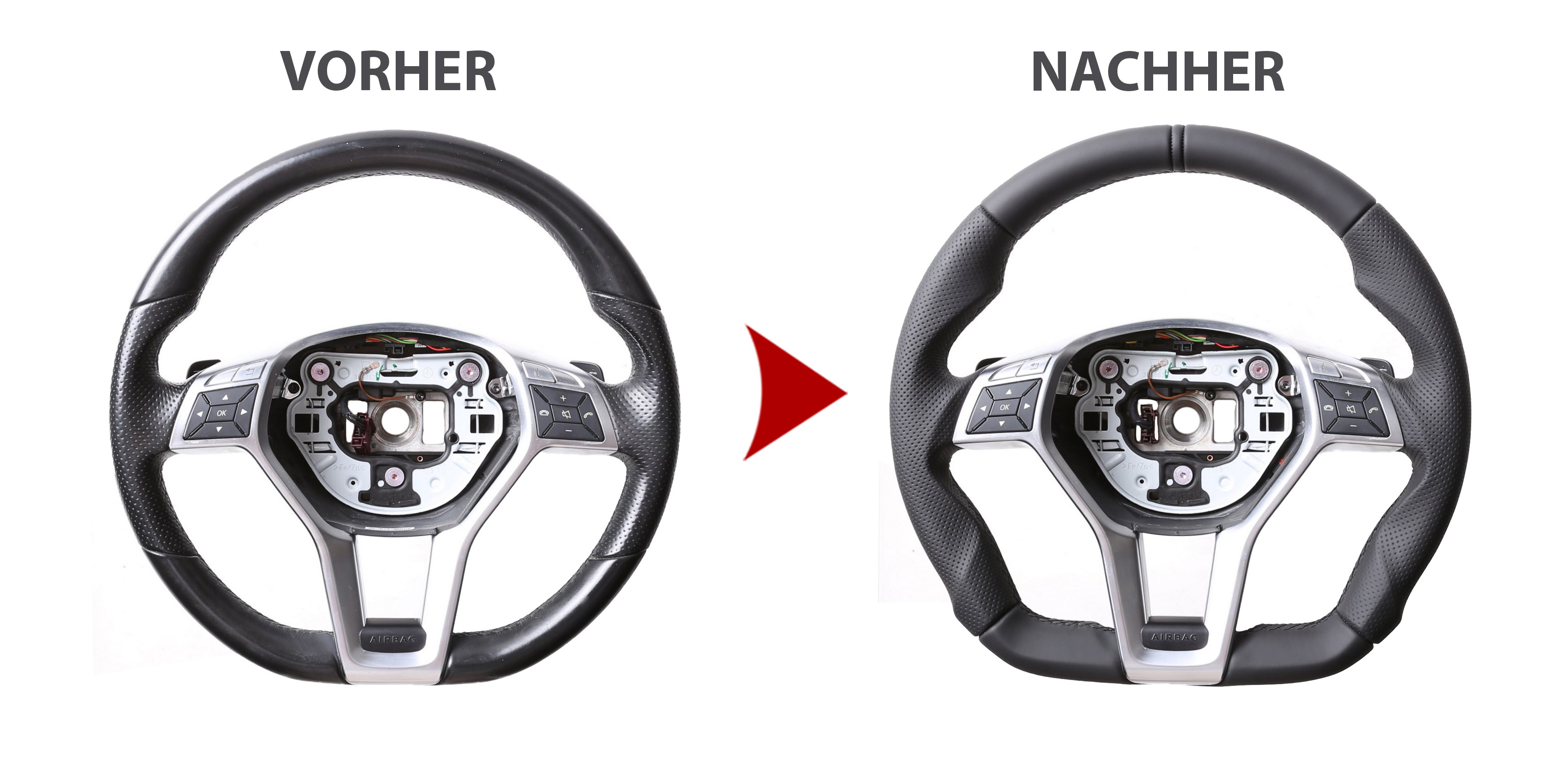 Der Austausch erfolgt ausschließlich gegen ein baugleiches Lenkradmodell. Alle Anbauteile wie Airbag, Multifunktionstasten, Blenden, Schaltwippen oder gar ein Spurhalteassistent übernehmen Sie problemlos von Ihrem Lenkrad. Diese sind nicht im Lieferumfang enthalten.