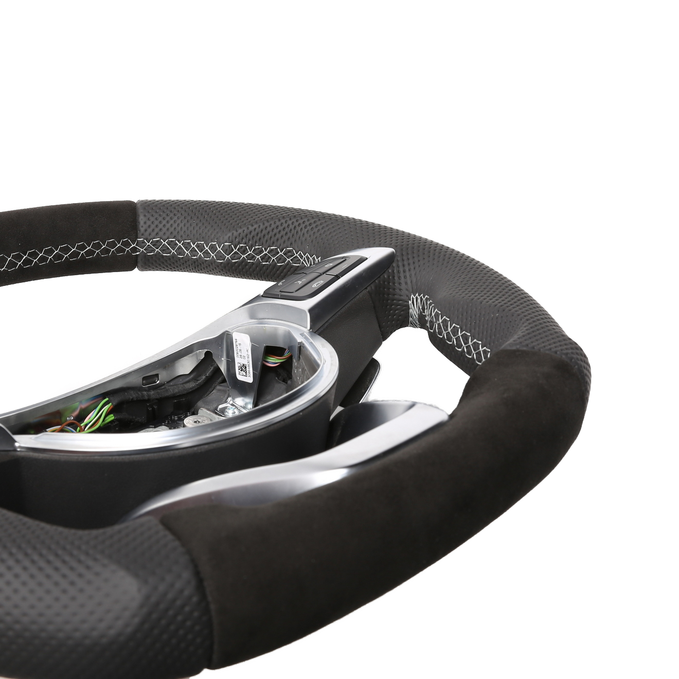 Originalfarbe schwarz, ein Kombibezug aus Alcantara und perforiertem Leder, 12 Uhr Markierung silber, Naht silber