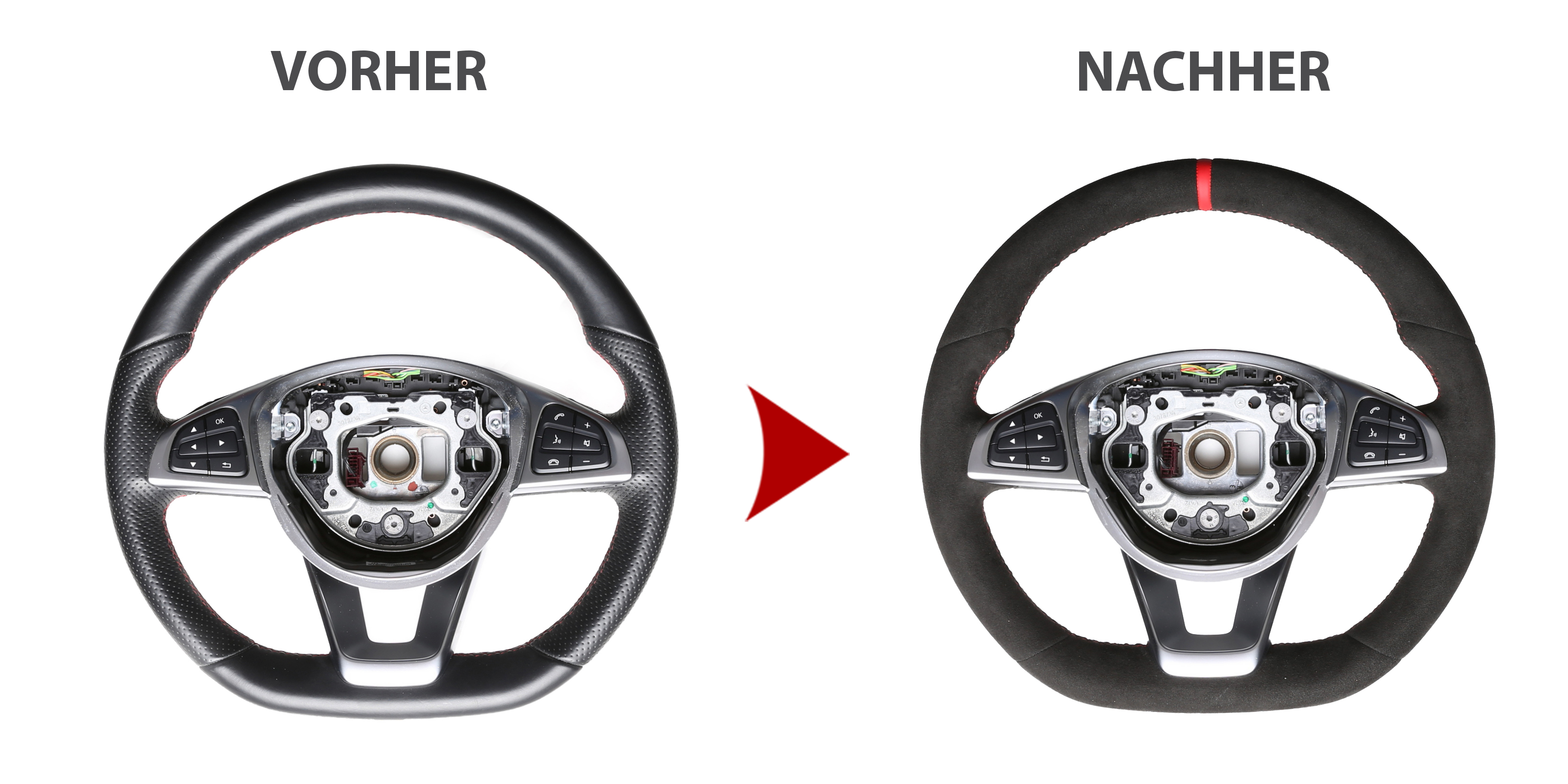 Produktinformationen "Mercedes Lenkrad B CLS GLC SLK Klasse W246 C218 X253 R172 Alcantara 12 Uhr Markierung rot Naht rot"