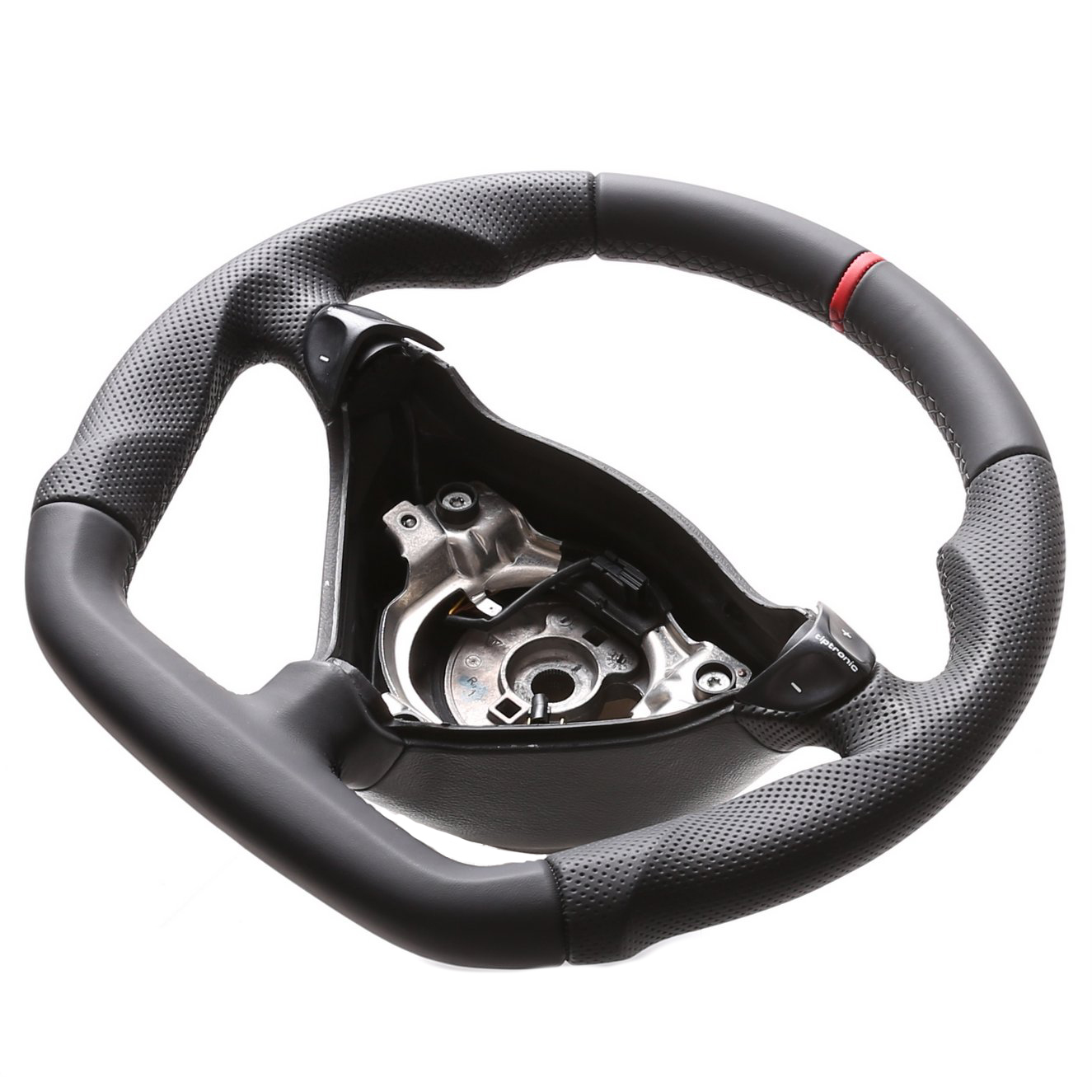 Originalfarbe schwarz, ein Kombibezug aus Porsche Nappa und perforiertem Leder, 12 Uhr Markierung rot, Naht schwarz