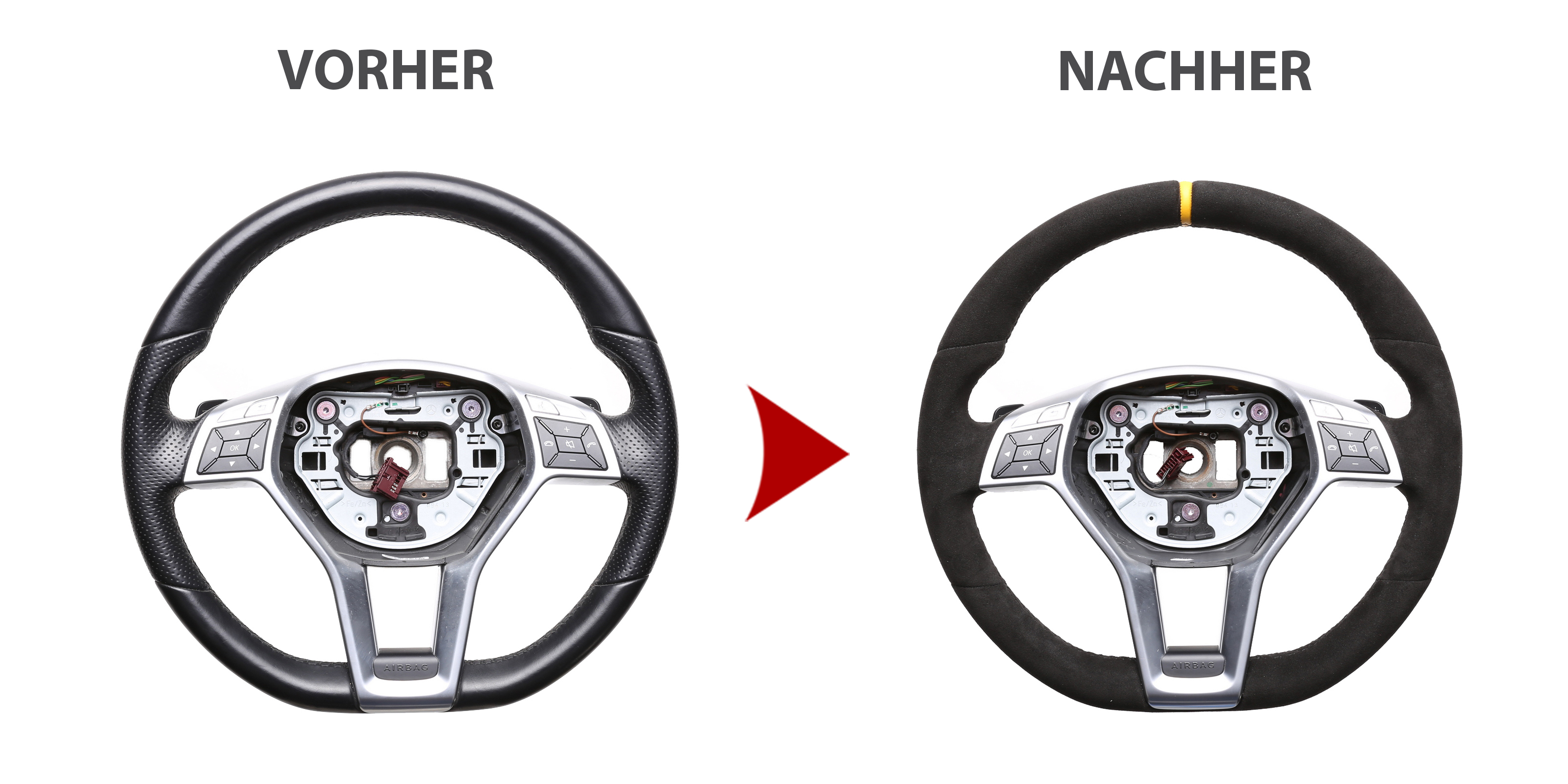 Originalfarbe schwarz, ein Kombibezug aus Mercedes Nappa und perforiertem Leder, 12 Uhr Markierung gelb, Naht schwarz