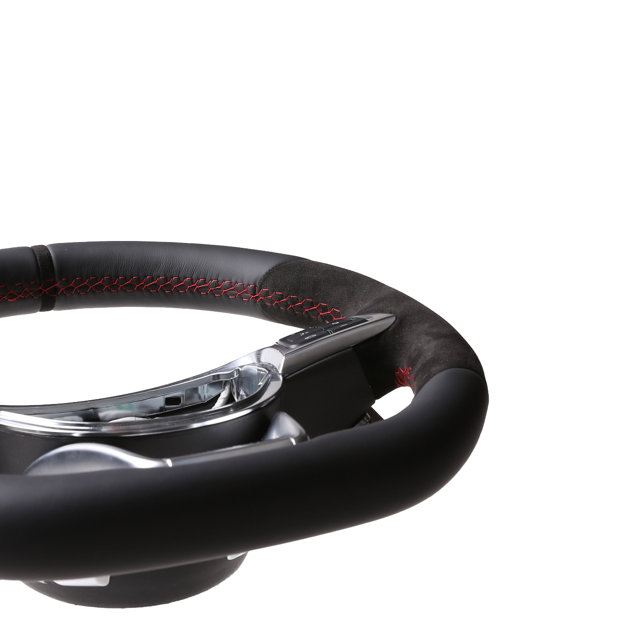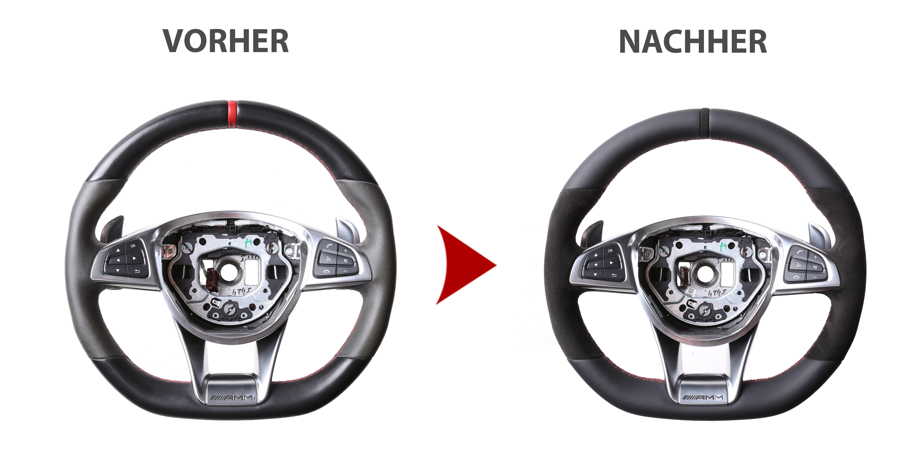 Originalfarbe schwarz, ein Kombibezug aus Mercedes Nappa und Alcantara Leder, 12 Uhr Markierung, Naht rot