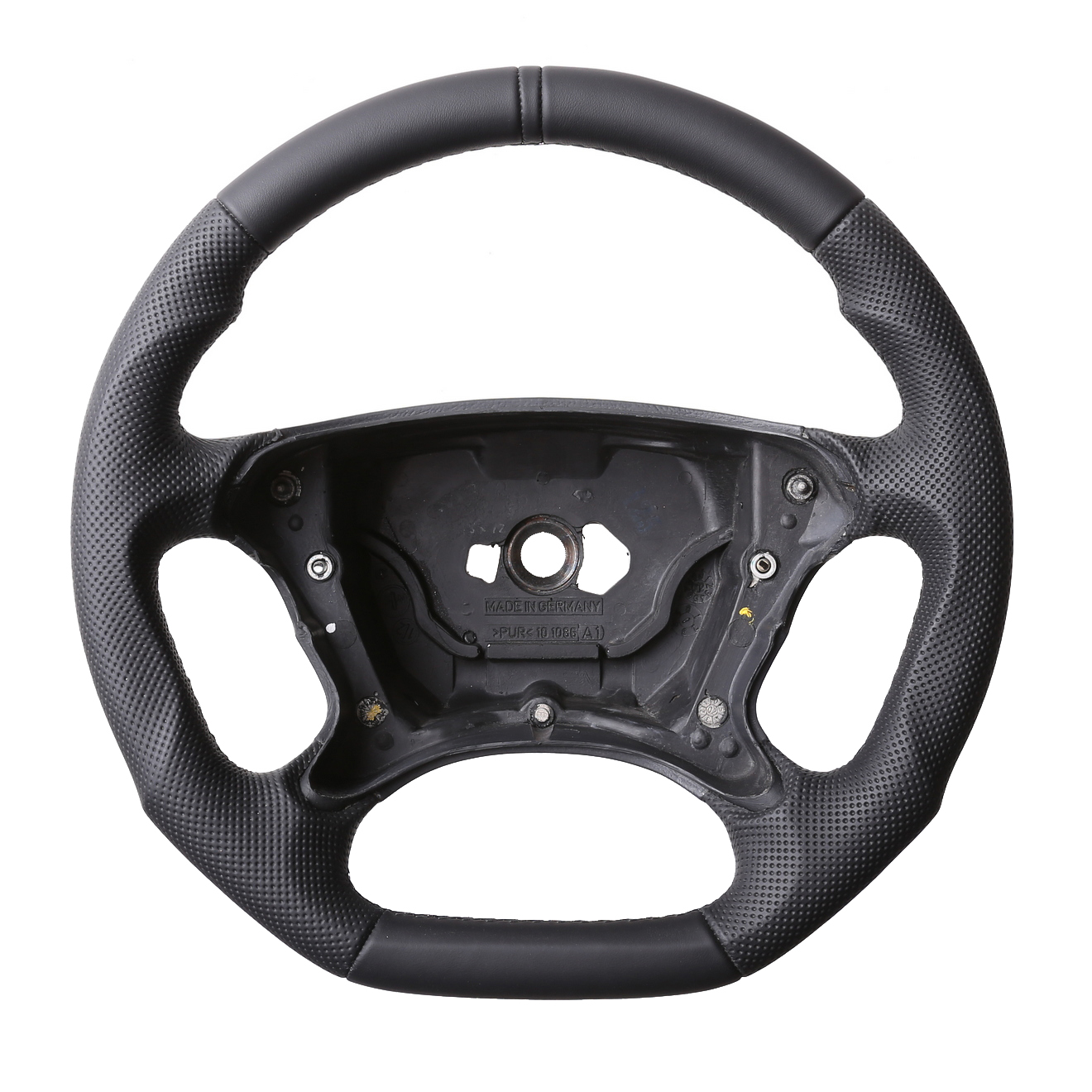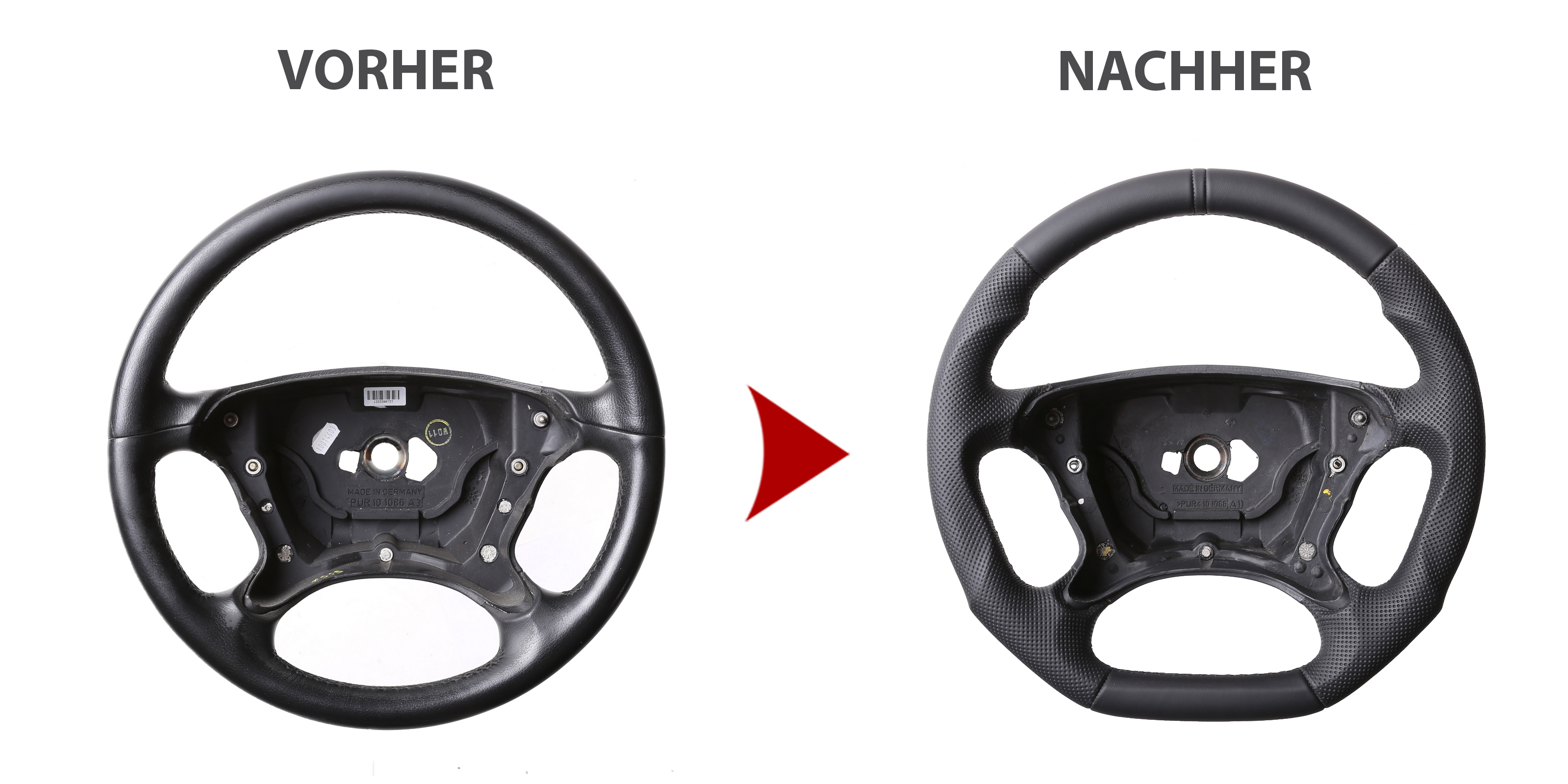 Originalfarbe schwarz, ein Kombibezug aus Mercedes Nappa und perforiertem Leder, 12 Uhr Markierung schwarz, Naht schwarz