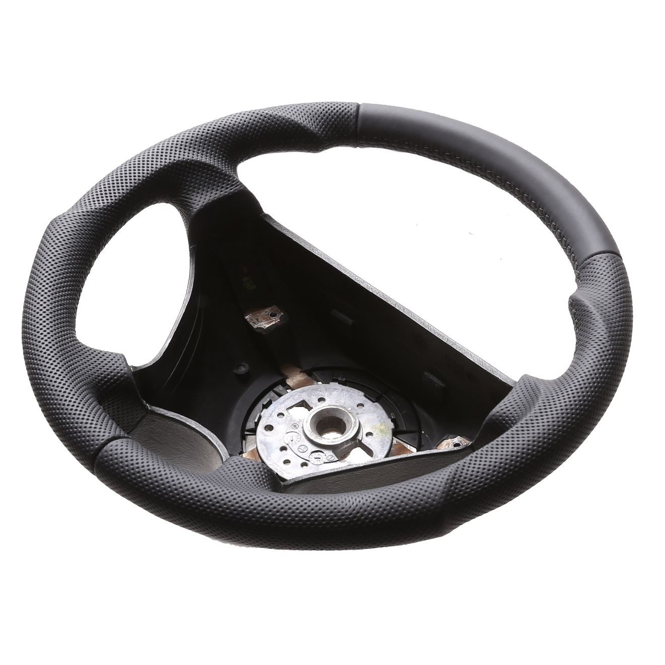 Wir verarbeiten ausschließlich Original Automobilleder, die Farbe nennt sich Soul und sieht eher Anthrazit aus als schwarz. Die moderne Autolederindustrie verwendet bei Porsche, Mercedes, BMW usw. keine tiefschwarzen Töne mehr wie früher. Das Leder wird heutzutage durch eine dünne Polyurethan Schicht (die besonders resistent gegen Handschweiß ist) und mattere Farben speziell geschützt. Auch eine Perforation am Leder (die bei uns im Hause durchgeführt wird) verändert nicht die Pflegeleichtigkeit.