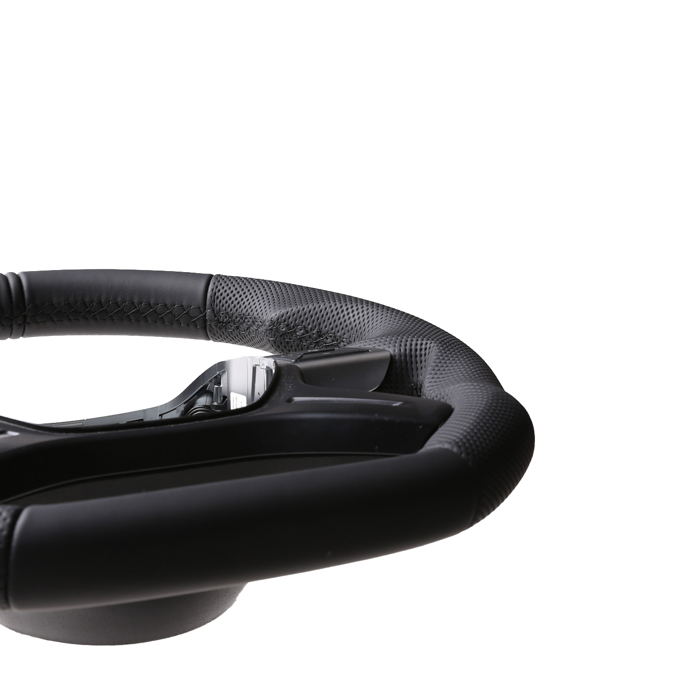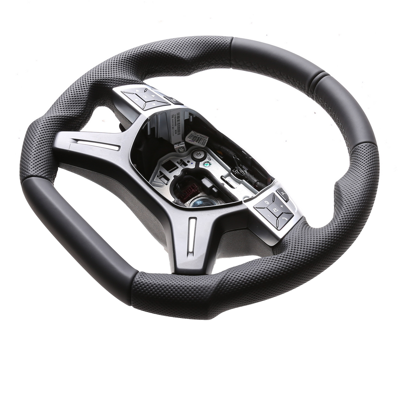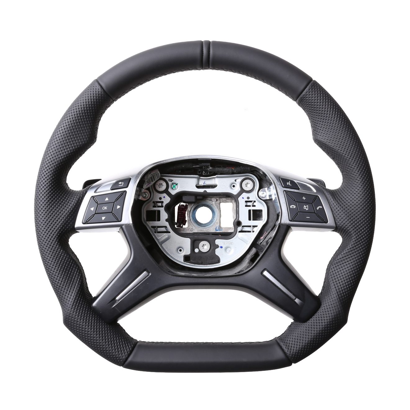 Originalfarbe schwarz, Kombibezug aus Mercedes Nappa und perforiertem Leder, 12 Uhr Markierung schwarz, Naht schwarz.