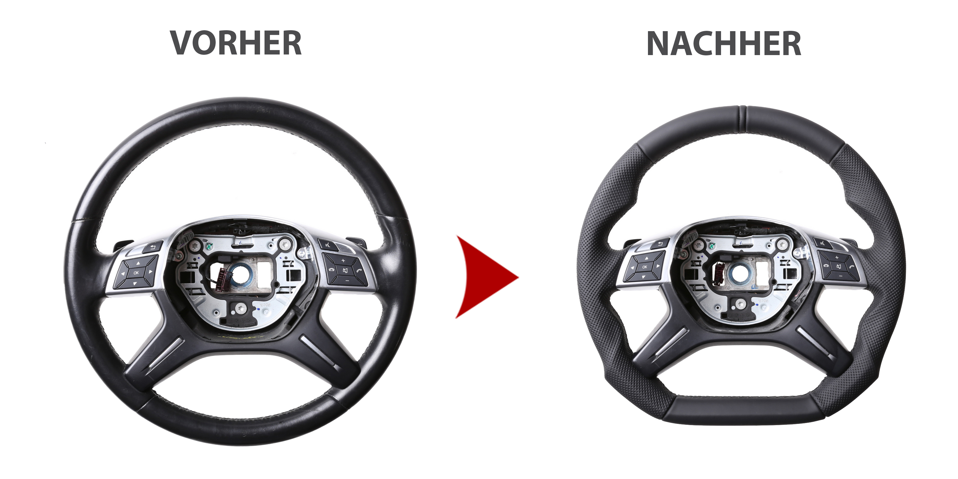 Ob Sie einen einfachen Neu Bezug des Lenkradmodells wünschen oder das Tuning Design oder aber ein abgeflachtes Design, der Preis ist bei allen Varianten gleich. Der Grund: das hohe Alter der Fahrzeuge und dessen Lenkräder. Diese sind sehr abgegriffen und weisen zum größten Teils starke Defekte am Lenkradkranz auf. Dies bedeutet für uns, den gleichen Arbeits,- und Materialaufwand für alles Designs.