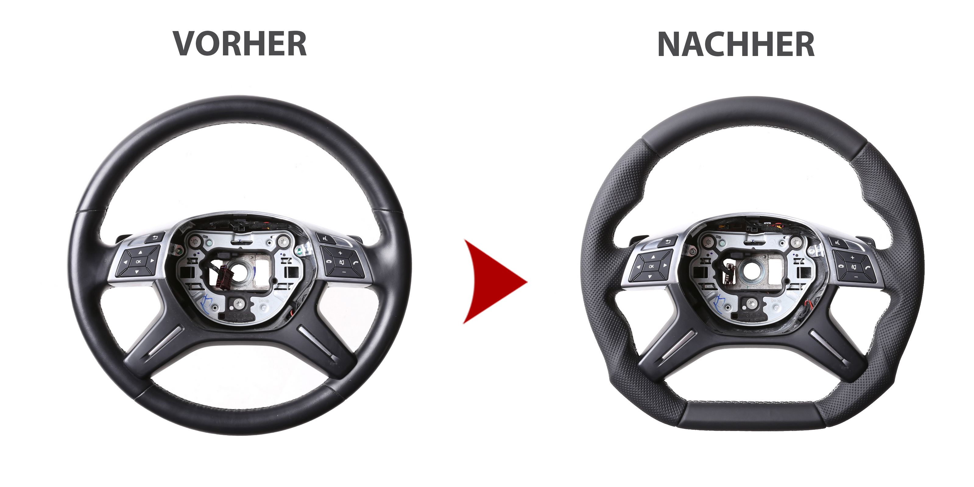 Ob Sie einen einfachen Neu Bezug des Lenkradmodells wünschen oder das Tuning Design oder aber ein abgeflachtes Design, der Preis ist bei allen Varianten gleich. Der Grund: das hohe Alter der Fahrzeuge und dessen Lenkräder. Diese sind sehr abgegriffen und weisen zum größten Teils starke Defekte am Lenkradkranz auf. Dies bedeutet für uns, den gleichen Arbeits,- und Materialaufwand für alles Designs.