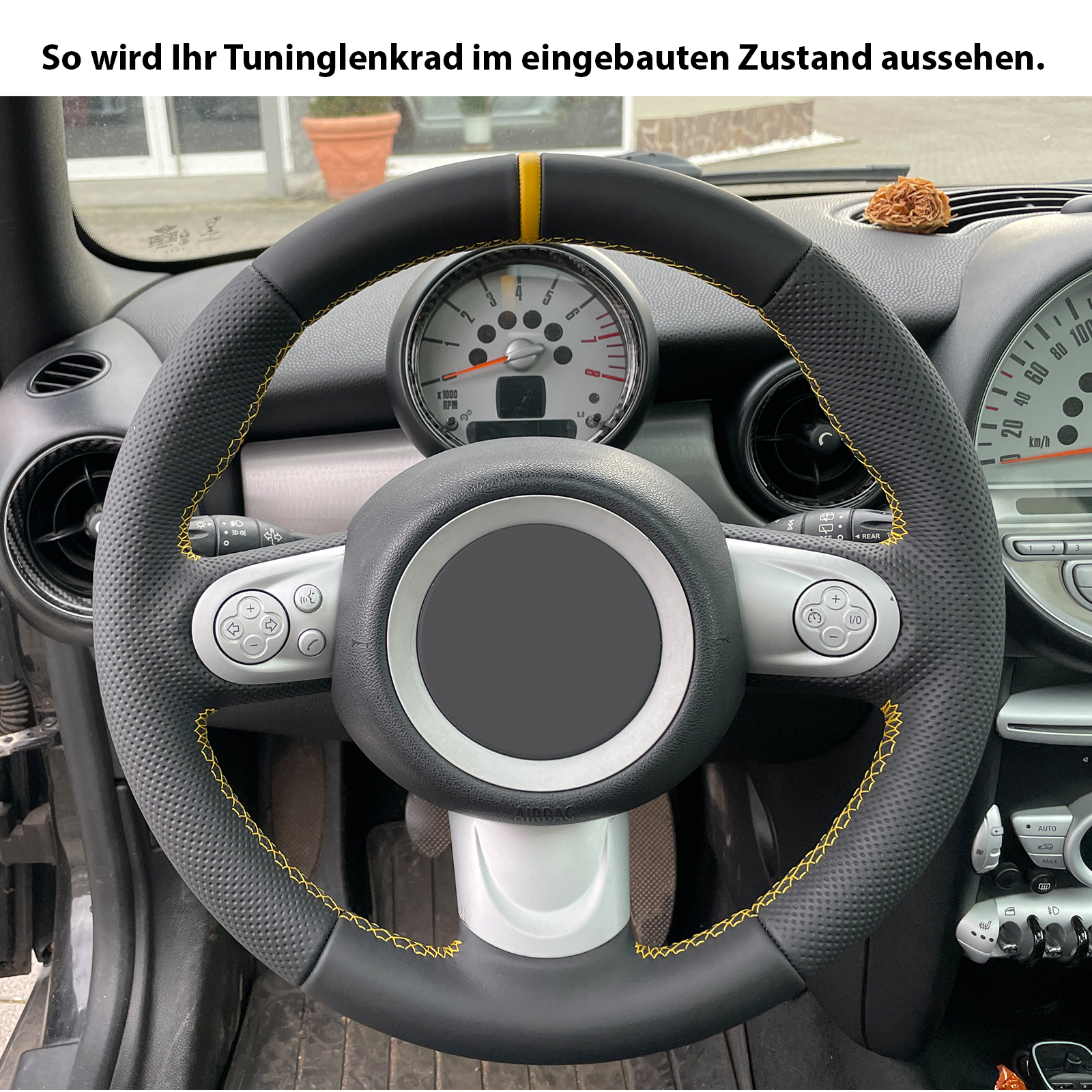 Produktinformationen "Mini Lenkrad One Mini Cooper R55 R56 R57 Kombibezug 12 Uhr Markierung gelb Naht gelb"