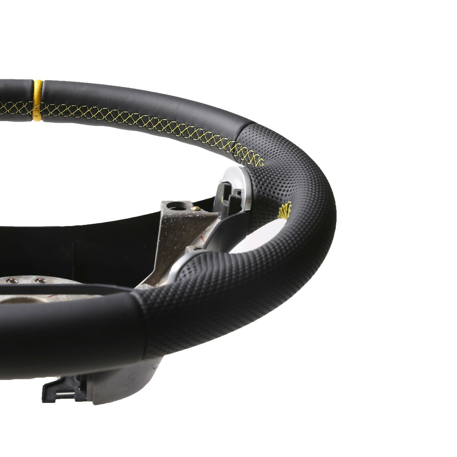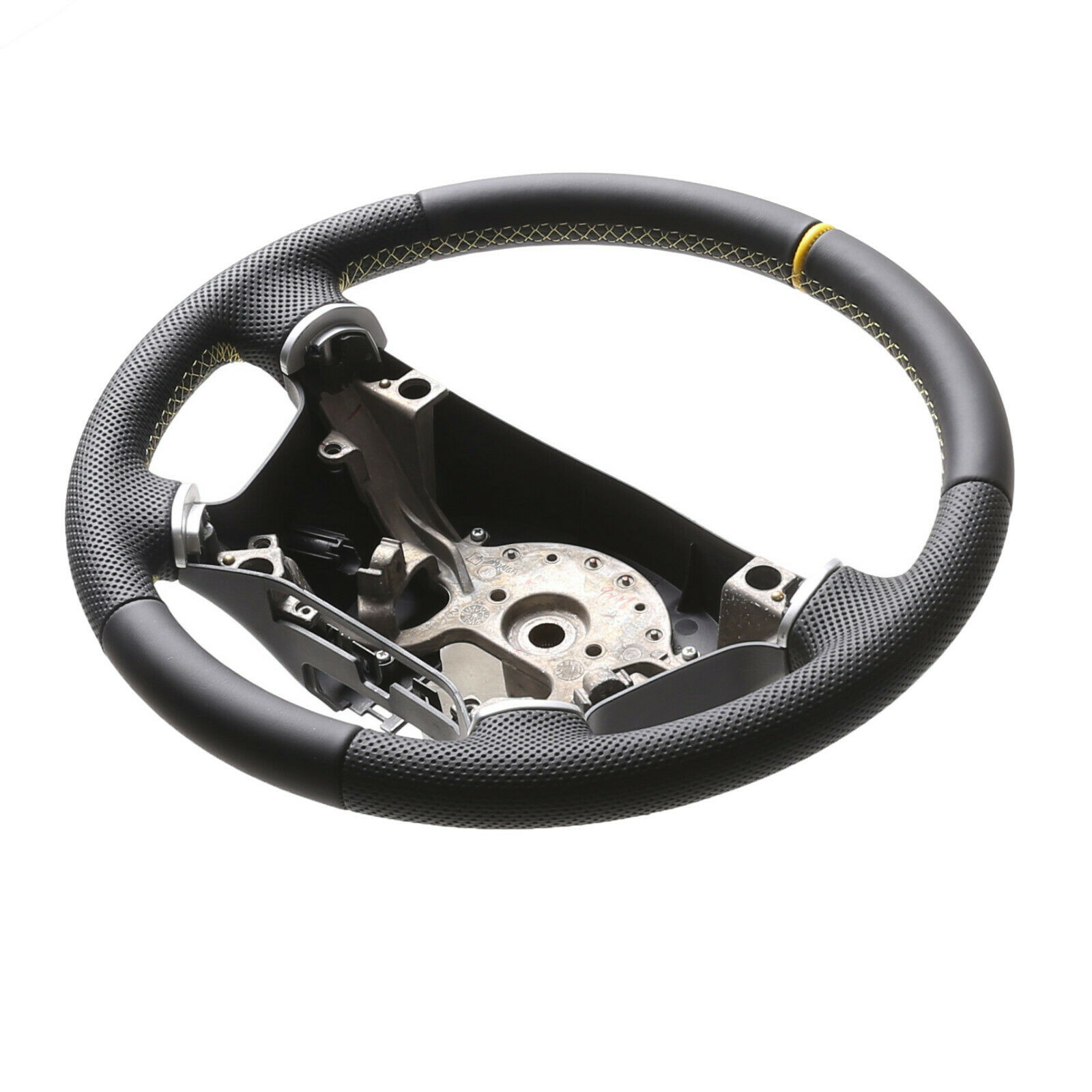 Originalfarbe schwarz, ein Kombibezug aus Jeep Nappa und perforiertem Leder, 12 Uhr Markierung gelb, Naht gelb