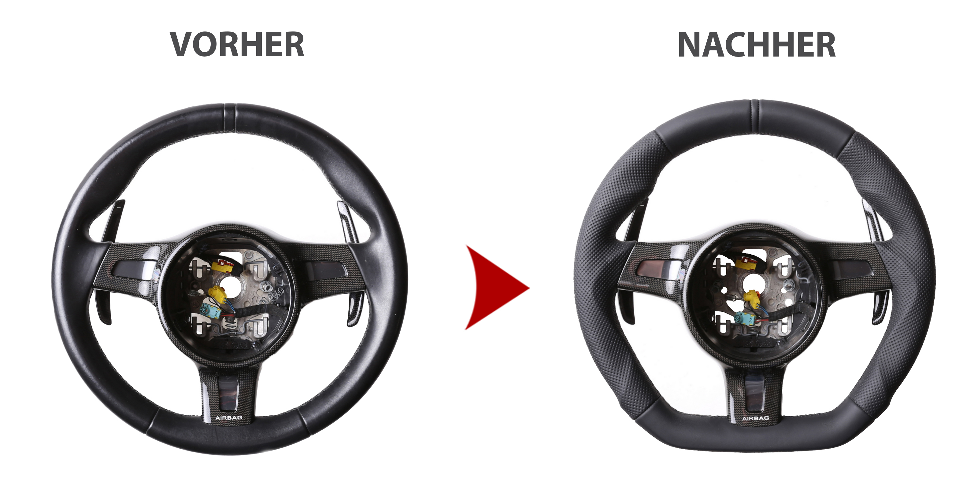 Beachten Sie bitte, dass wir dieses Lenkradmodell nicht im Austauschverfahren und auch nicht in der Leihlenkradvariante anbieten können. Ausschließlich Ihr eigenes Lenkrad kann bei uns neu bezogen werden. Gegen einen Aufpreis von 30€ ist auch eine Express Anfertigung innerhalb von 2-3 Tagen möglich.