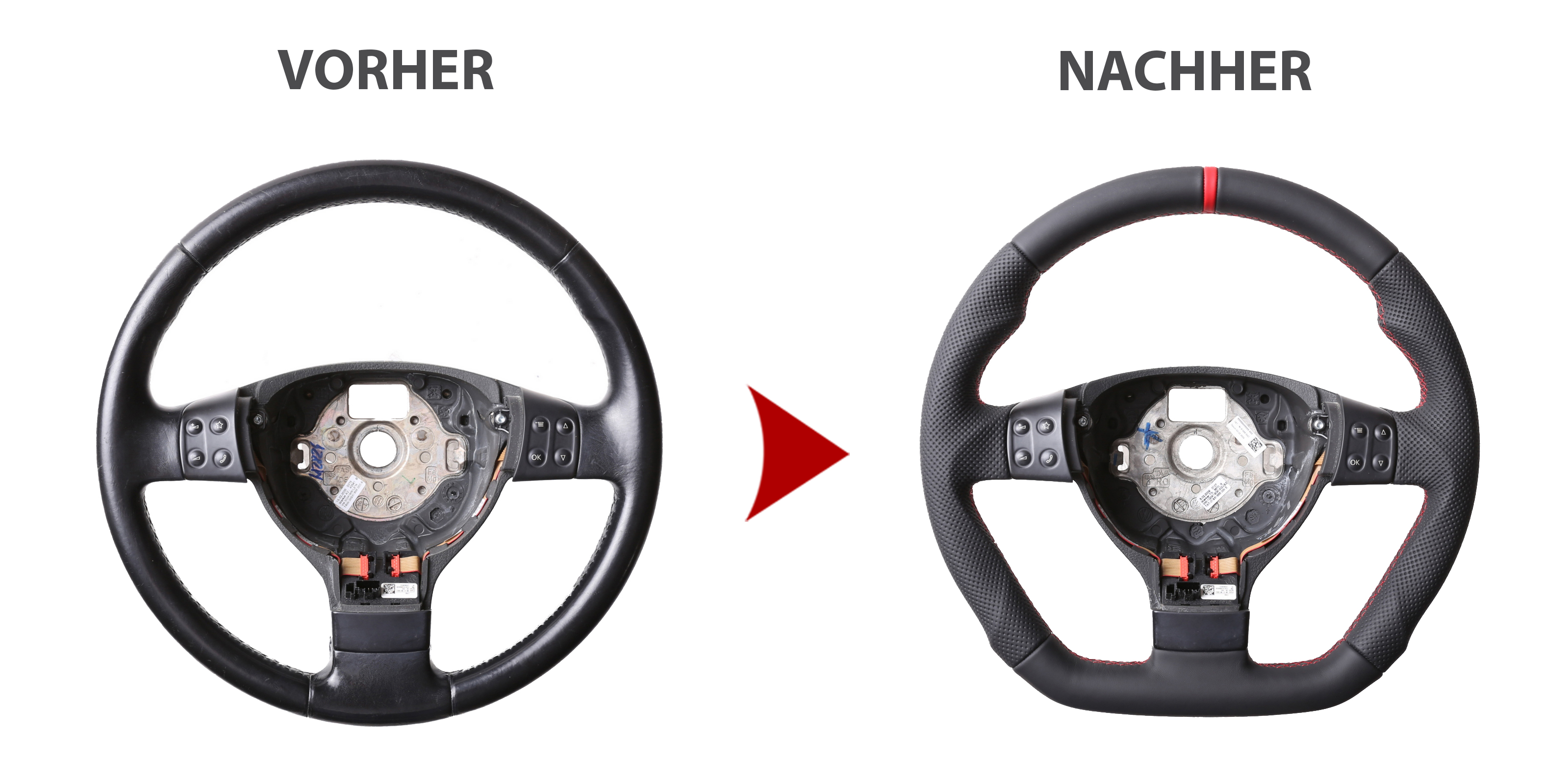 Originalfarbe schwarz, ein Kombibezug aus VW Nappa und perforiertem Leder, 12 Uhr Markierung rot, Naht rot